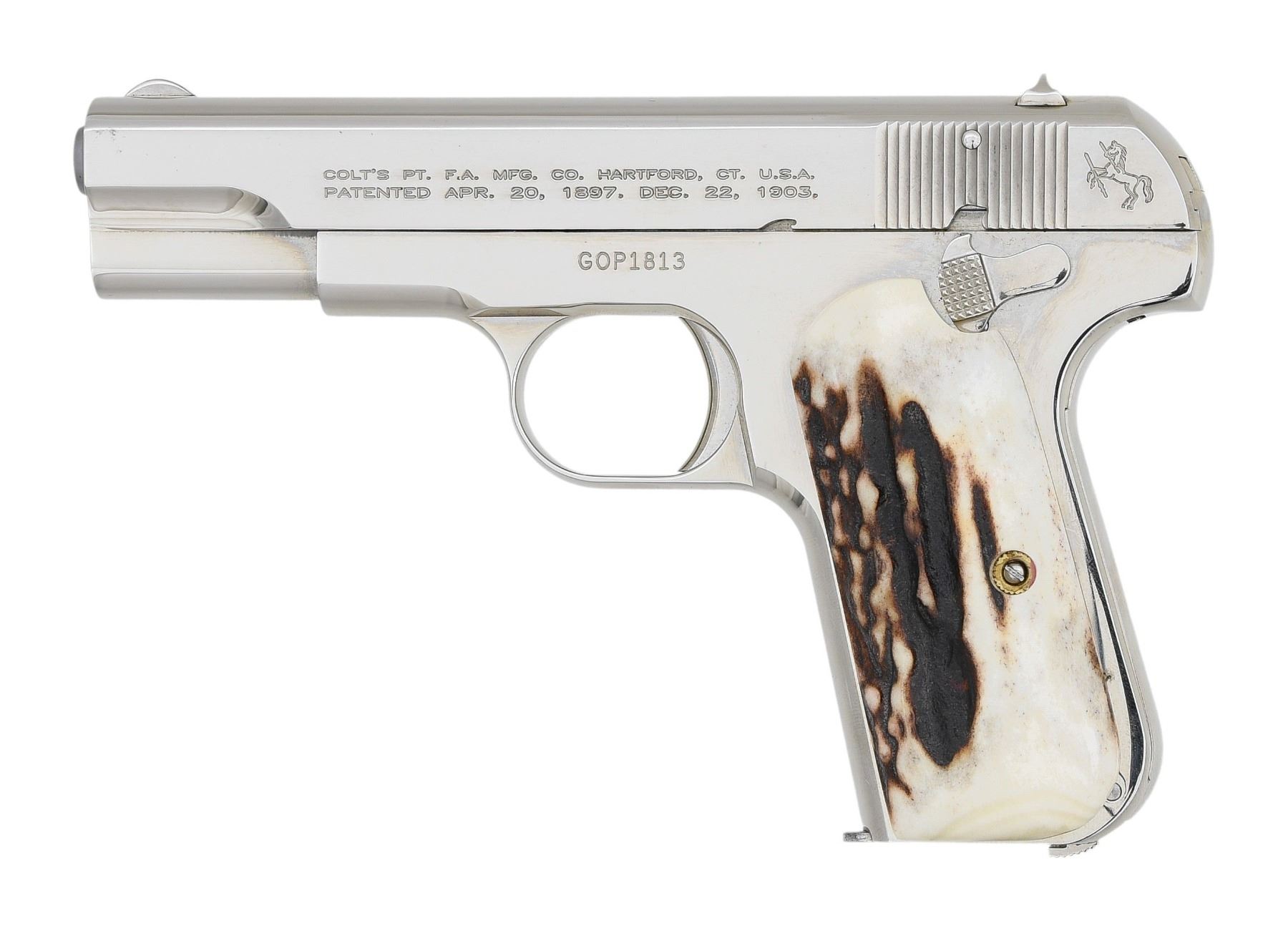 AUTO PISTOL. Cal. 32 ACP. S# GOP1813. Recreation of the Colt 1903 Pocket Hammerless with 3.75" bbl. Nickel finish. Two piece Stag grips. MAGS: 1 - 8 rd. CONDITION: very good to near excellent nickel finish & stag grip showing minor handling wear & spots of patina. Very good shiny rifling. (25-4695/MD). MODERN. $700-1,000.