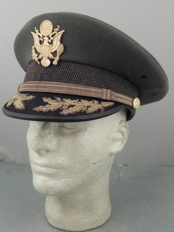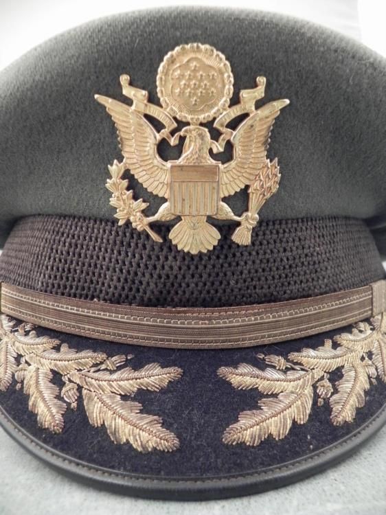 U.S. ARMY HIGH RANKING OFFICER'S VISOR HAT W/BULLION OAK LEAF CLUSTERS * * MADE IN TAIWAN CHINA MARKED INSIDE-HIGH QUALITY--WWII OR KOREAN WAR-GOLD EAGLE & GOLD CLUSTERS *