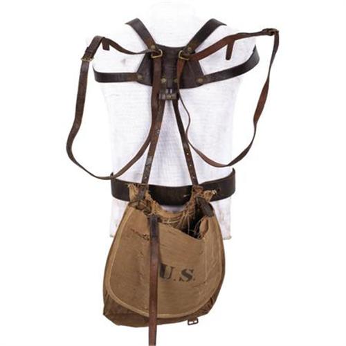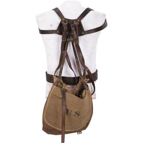 <B>U.S. ARMY 'PALMER' STYLE BRACE STYLE SYSTEM CIRCA 1874.</B></I> Manufactured at Watervliet Arsenal. Belt itself is actually from an experimental 1872 brace system. All other leather components are from the 1874 Palmer system. A remnant of a haversack is included with this lot.<BR><BR><B>Condition:</B></I> Leather components are pliable but could stand a good leather preservative treatment. 1872 pattern belt plate is an original replacement as it doesn't catch properly on the hasp. Haversack is in relic condition.<BR><BR><b>Shipping:</b> Miscellaneous Collectibles, Larg (<a target="_blank" href="http://www.heritageauctions.com/common/shipping.php">view shipping information</a>)