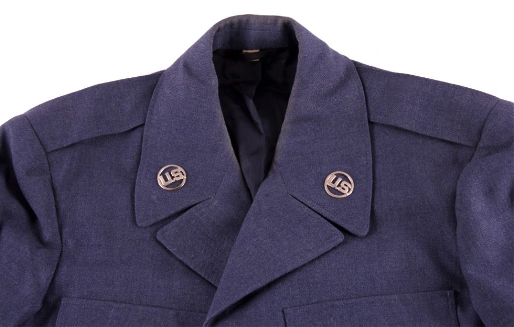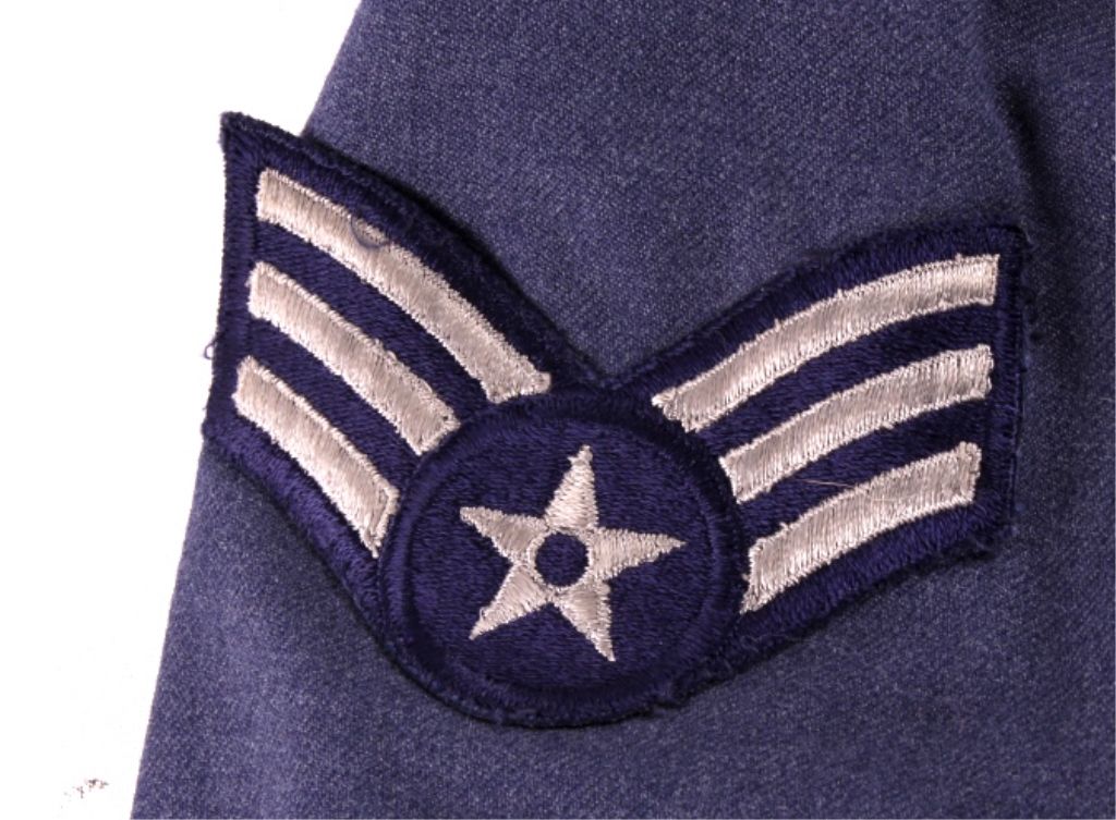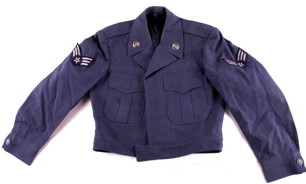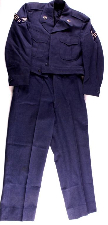 This is a U.S. Air Force Ike style jacket and  pants uniform. The jacket has two arm  patches and 2 "U.S." collar pins. The jacket  is size 37S. The pants are size 32x29. The  uniform is in good condition.