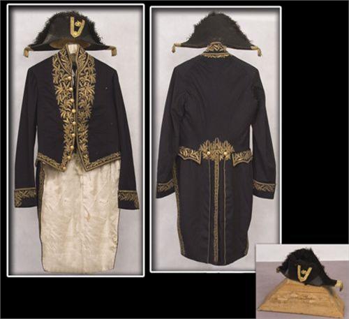 George G. Baker. His U.S. Ambassador’s Tailcoat With Hat. Coat has gold bullion decorations. Chapeau style hat with gold bullion and ostrich feather decorations in original box with his hame, Geo G Baker. c. 1880. Fine condition. (est $1,500-2,000)