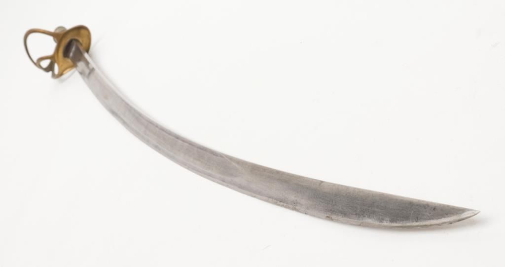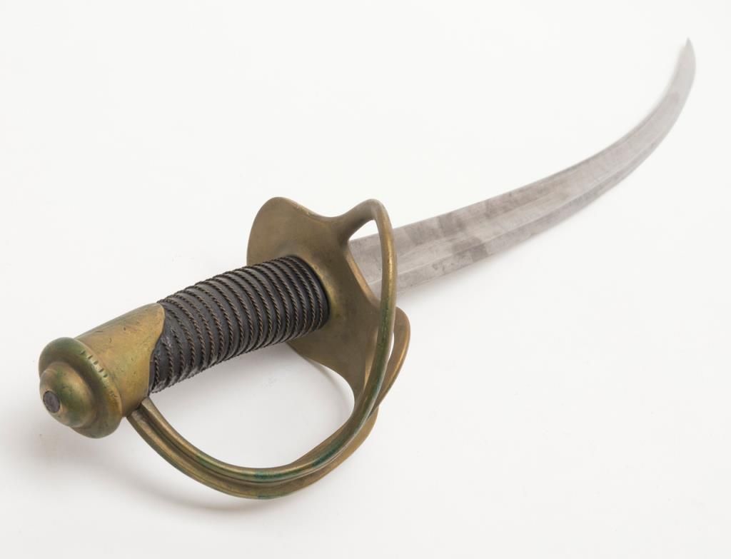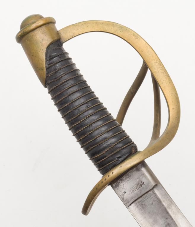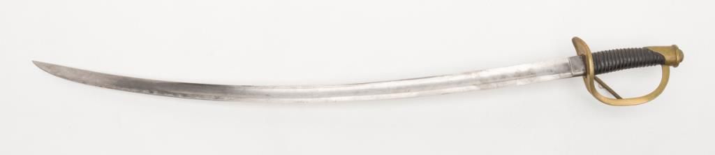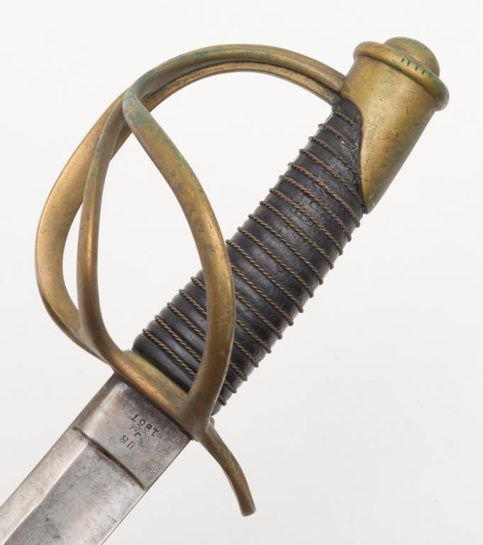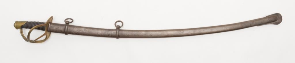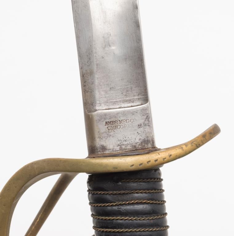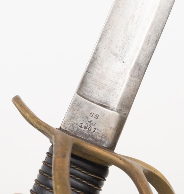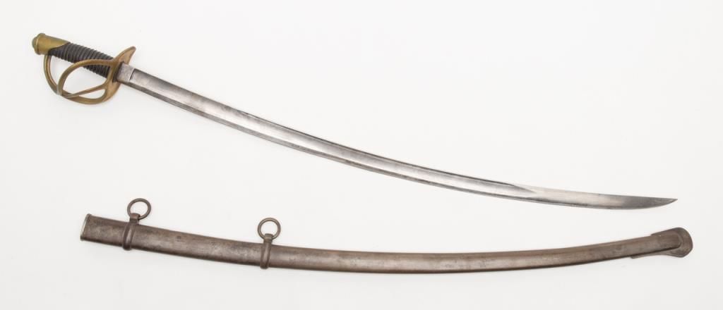 U.S. Ames Cavalry sword and metal scabbard dated 1857 in overall good to very good condition with a pleasing patina to the brass guard and wire wrapped leather grip. Est.: $300-$600.