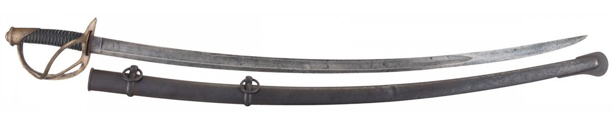 Measuring 41 inches overall, with a 35 7/8 inch double fuller blade, marked ""US/NWP" on the right ricasso and "N.P.AMES/CABOTVILLE/1845" on the left. Brass hilt with a two-branch guard, "w.a.j." and "NW" marked helmet pommel and wire and leather wrapped wood grip. With an iron sheath. The leather covered grip has a twisted wire wrap.