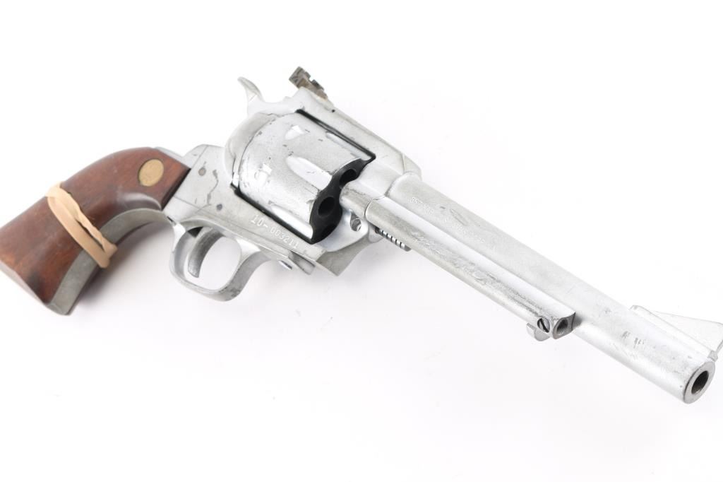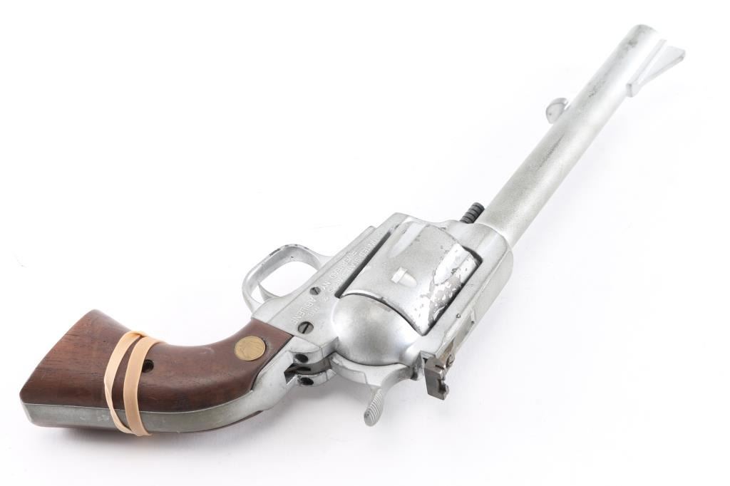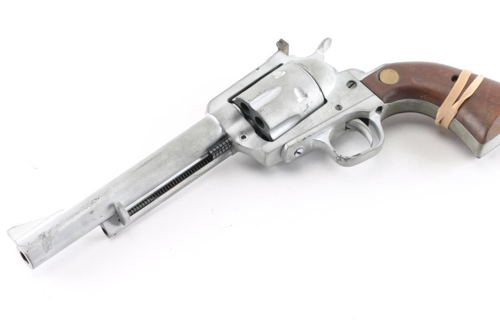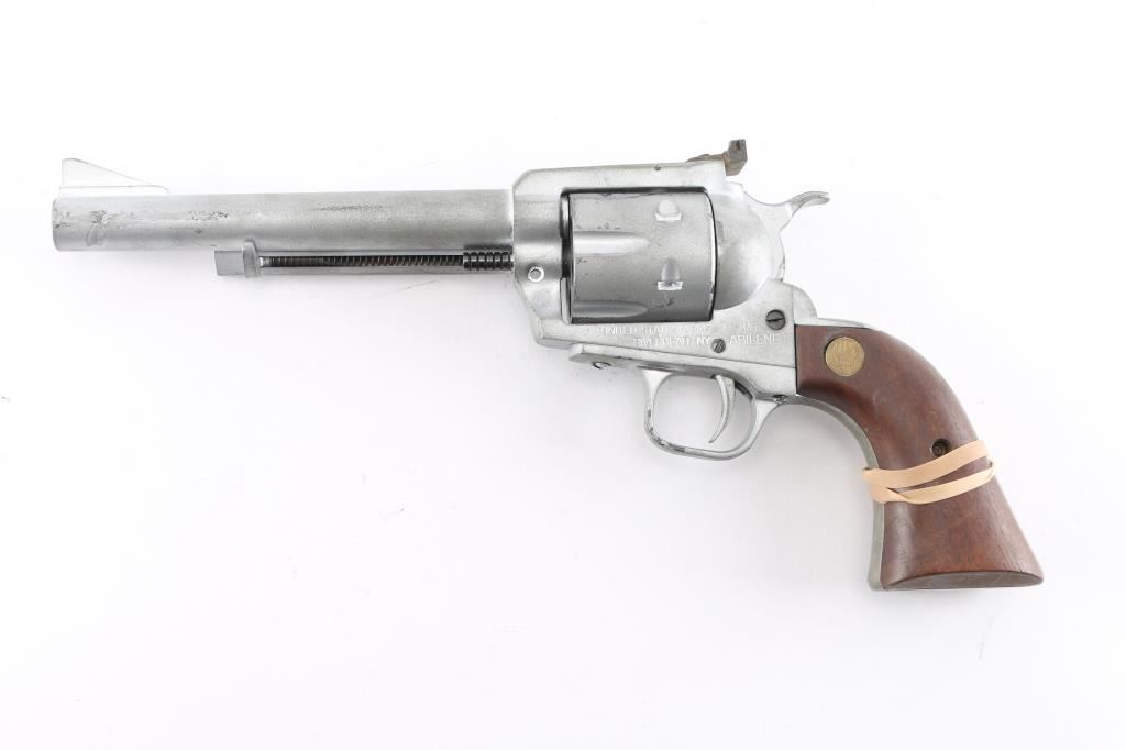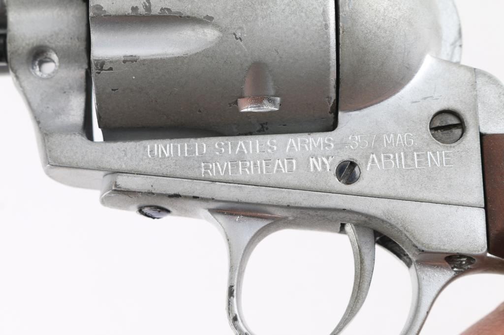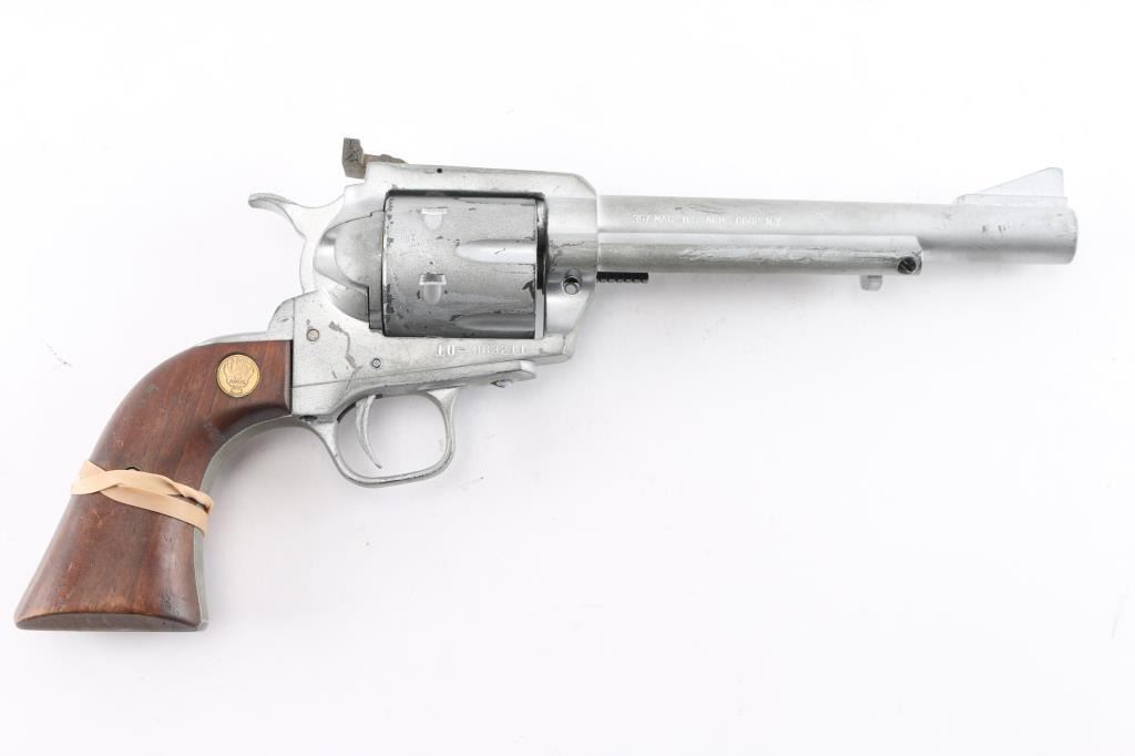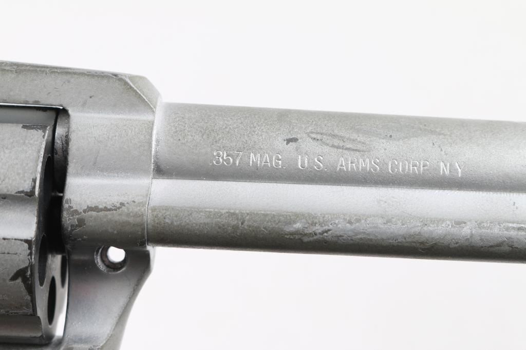 Single action revolver chambered in .357 Magnum, Refinished in matte gray, 6.5" barrel with serrated blade front, and adjustable square notch rear sights, serrated trigger, smooth wood grips with US Arms medallions. Bore appears good/bright, finish has scratches/scuffs, finish loss , mostly on the receiver, left grip panel is not attached, needs a new screw & escutcheon , missing the cylinder rod stop.
