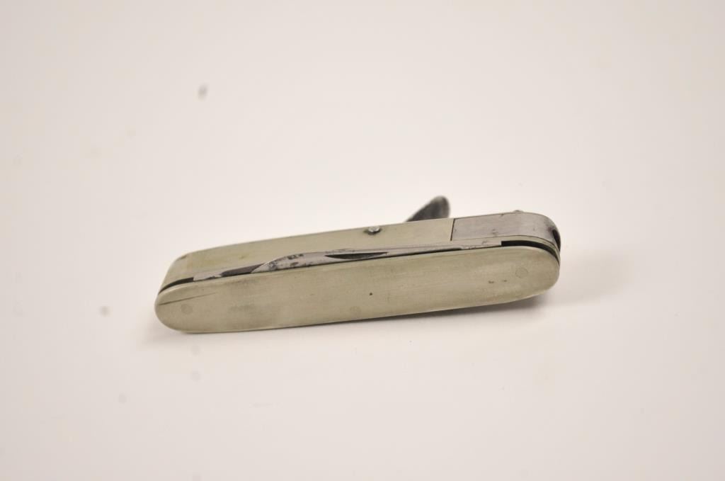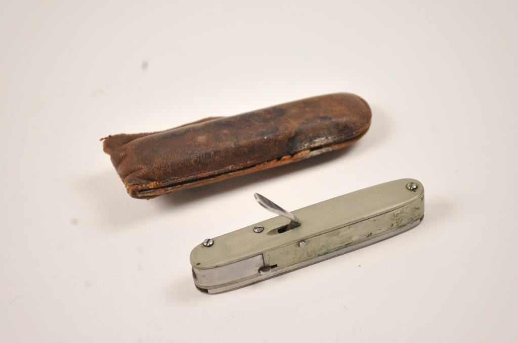 U.S. Arms Co. (Chicago, Illinois) .22 caliber, knife pistol circa 1915-1916 marked-“PATENT PAID FOR” and “DEFENDER” on both blades. Approximately 3 1/8” in overall length when folded, including original chamois leather case. Invented by L.L. Rogers, Boston, Mass. And showing 1.5” and 1.25” folding blades with a German steel body and steel blades. A research folder accompanies the lots with 1916 era advertisements in outing magazines showing this type of oddity. Also, a newsletter from the automatic knife resource guide & newsletter with an article on this subject weapon. A handful of L.L. Rogers knife/pistols of this type are known (less than 5) and it is the only example marked, “PATENT PAID FOR” indicating early production or prototype for display. This piece has been in local family since before WWII. The condition is near fine but action needs repair and not working. The side scales are removable by screws making repair relatively simple. Classified as curio and relic under National Firearms Act Section IV-(3A-Pg.90-91). Est.: $2,000-$4,000.