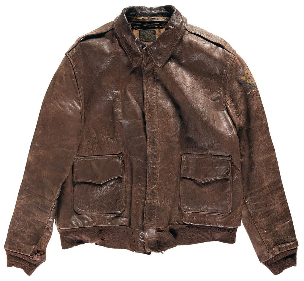 Established in 1942, the 8th Air Force was one of the chief units participating in the American strategic daylight bombing campaign, with a unit strength of 200,000 men at their peak. After the surrender of Germany, they relocated to the Pacific in anticipation of the invasion of the Japanese Home Islands, but Japan surrendered before combat operations could commence. Following World War II, the 8th became a component of the United States Air Force, joining the Strategic Air Command and becoming a primary operator of the B-52 Stratofortress in both the strategic nuclear bombardment role and also for conventional bombing in Vietnam and the Gulf War. The jacket is brown leather construction with a brown cloth liner, bearing an faint Army Air Force label on the interior, the painted 8th Air Force logo on the left shoulder, and a multicolored postwar applied painting on the back of a bee standing on a cloud wearing an Air Force hat, a pair of boots with a dagger tucked into one , and a pair of revolvers, with "BOISE/BEE" marked around it. Boise Bee was the P-51 Mustang of Duane Willard Beeson, a native of Boise, Idaho who achieved 17 aerial kills, spending part of his wartime service with the Canadian RAF (they didn’t require a college education) before joining the 8th. Beeson is one of only 10 pilots to become an "Ace" in more than one aircraft, scoring 12 in a P-47 Thunderbolt and another 5 in the Mustang. A restored Mustang bearing Beeson's markings is still flying as of this writing. The pants are World War II German-made "channel" pants, tan cloth construction with plastic zippers and no size markings. From the Putnam Green Collection.