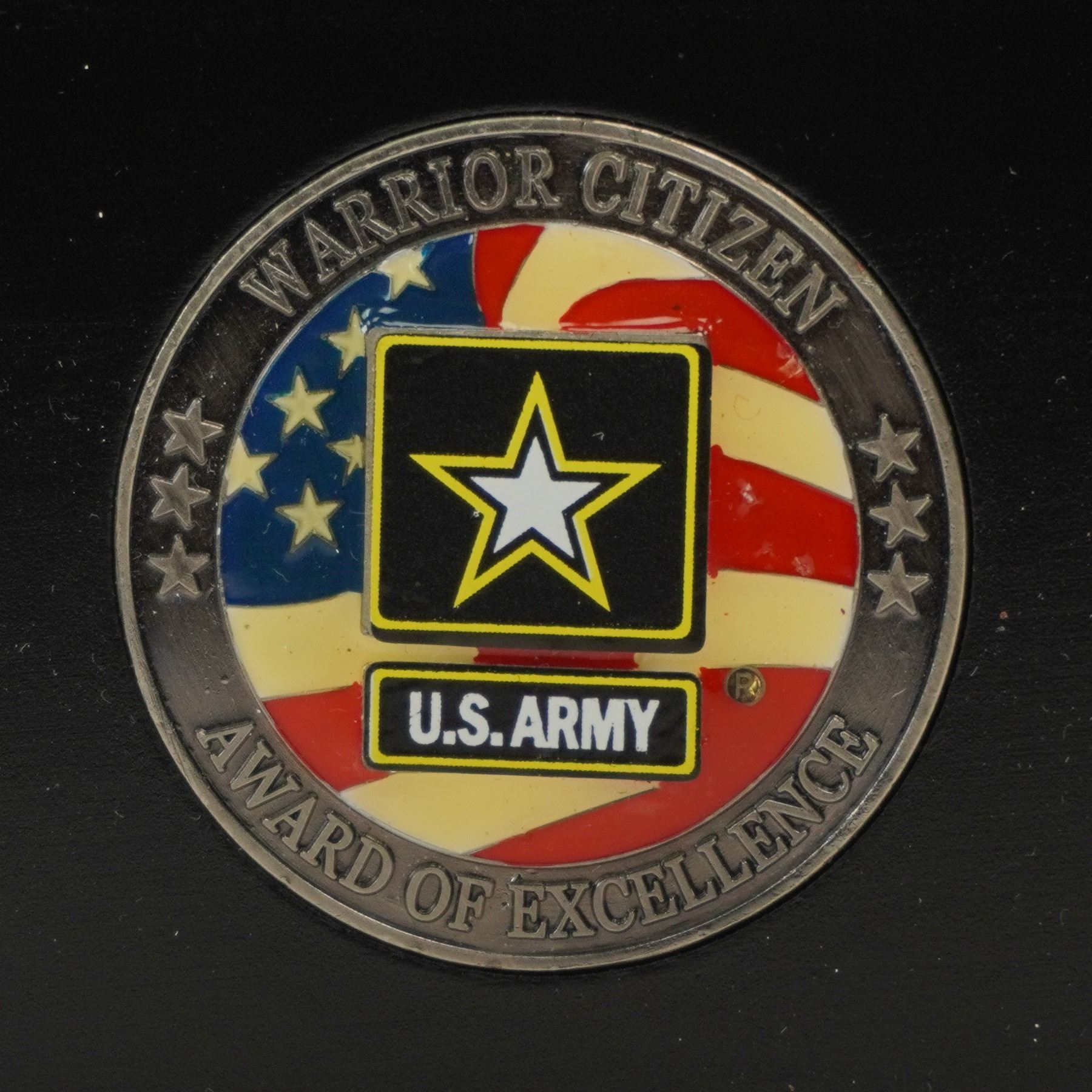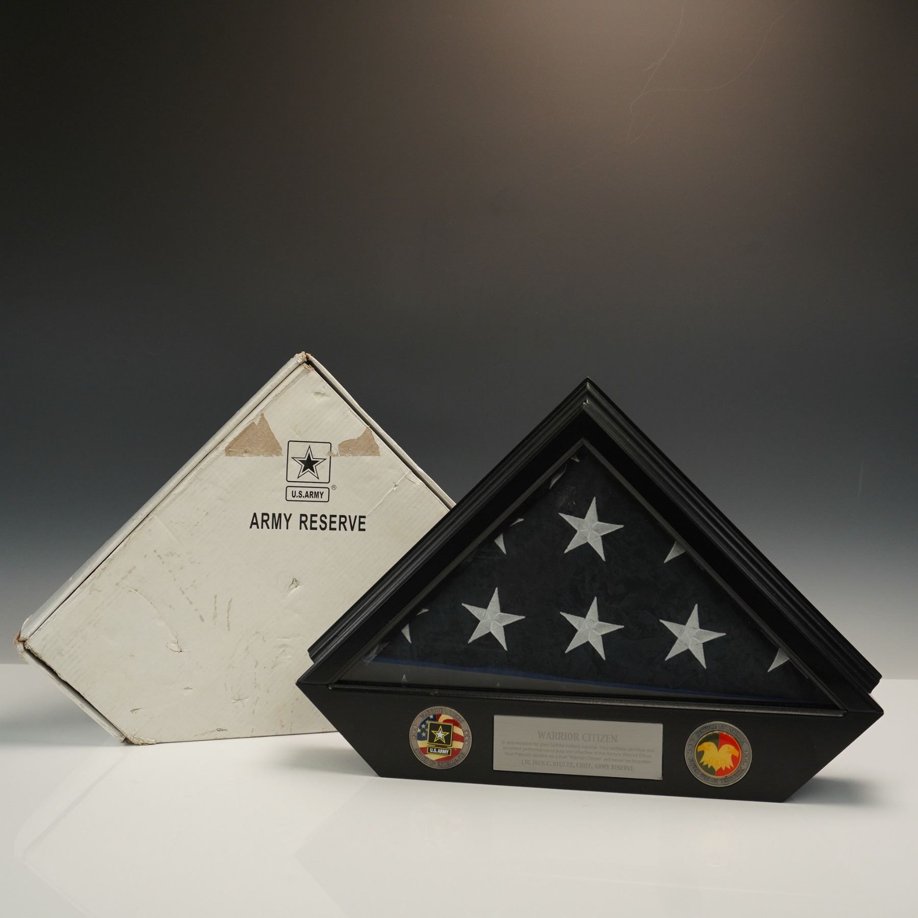 Military flag display case honoring Lieutenant General Jack C. Stultz, Chief of the U.S. Army Reserve. The triangular case includes a folded American flag, two commemorative U.S. Army challenge coins, and a central plaque engraved with a message of appreciation for military service. The coins are marked Warrior Citizen, Award of Excellence and Service to America, Global War on Terrorism. A solemn tribute recognizing distinguished leadership and patriotic duty. This item has its original box.