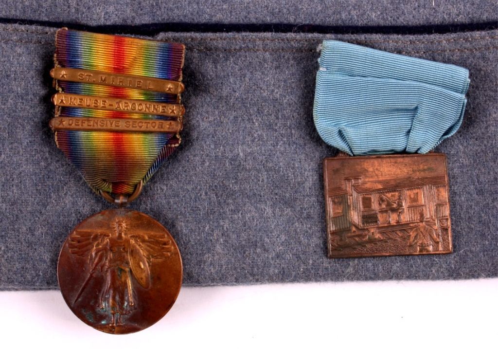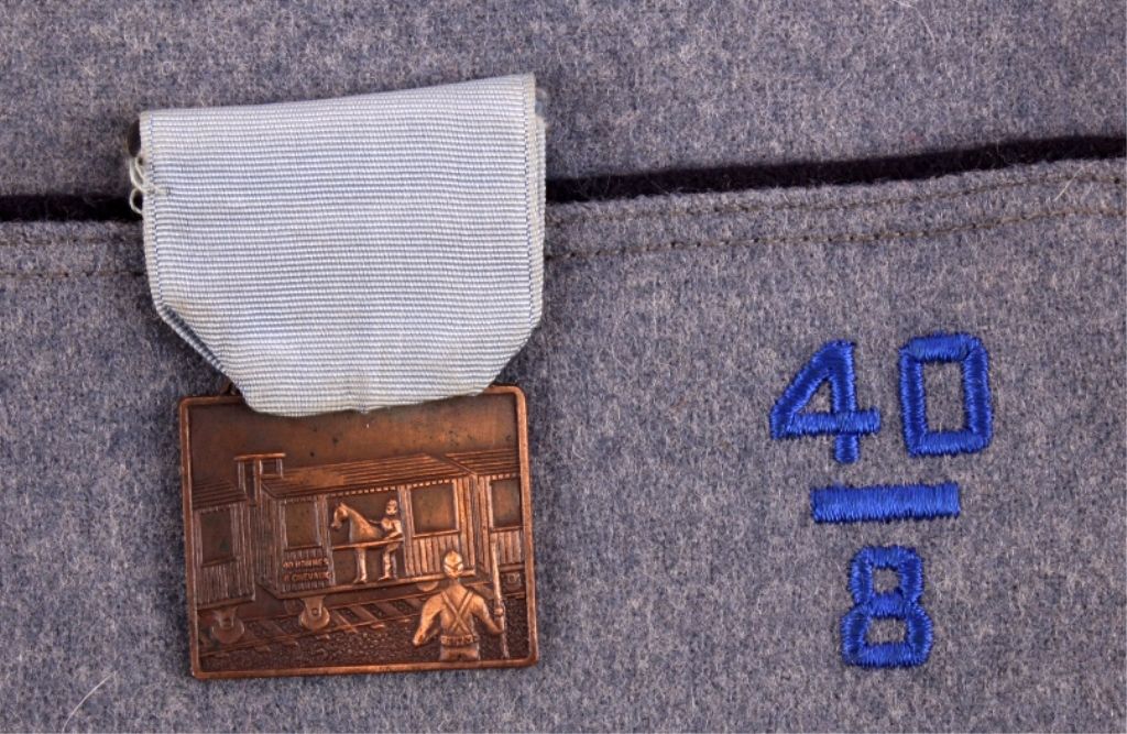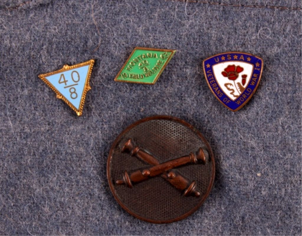 This is a pair of U.S. Army garrison caps. One cap is adorned with a 40/8 ribbon and medal and has patches that read "California Republic" and "Grand Wrecking Crew". The other cap has a campaign medal, a 40/8 ribbon and medal, and American Legion pins. Both garrison caps are in very good condition.