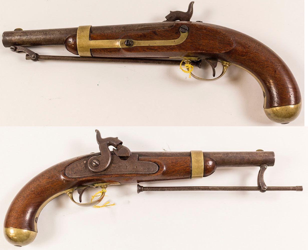 This is a Model 1842 Army pistol made at the Palmetto Armory in Columbia, South Carolina. This piece is dated 1849 on the tang. The gun has an 8 1/2 in. round smooth bore barrel with attached ramrod swivel. The lock is a factory replacement G. Goulcher percussion lock that fits the original lock mortise well. All hardware on the gun is brass that includes the single barrel band, trigger-guard, side-plate, back-strap and butt-plate. This gun is beautifully cartouched with a number of U.S. Ordinance Inspector's markings on the walnut stock. The barrel is marked "P" (Palmetto), "NWP" (Nathum W. Patch) all under "US". The stock is marked "WAT" (William Anderson Thornton) and "JH" (John Hannis) in two separate cartouches on the left side lock mortise area. These men, all U.S. Ordinance inspectors, lived long productive lives in American firearms history. The letter "H" is also stamped on the side-plate and barrel band combination and on the forward tang of the trigger-guard by a sub-inspector indicating that the gun was repaired at some point in its military history. This gun would make a handsome addition to anyone's gun collection of American military firearms. This gun is an antique and no attempt has been made to fire this gun to confirm it's mechanical integrity; nor should this gun be fired. Any attempt to fire an antique gun is at the risk of the owner and not consistent with the value of the firearm. Date: Location: HWAC # 55318