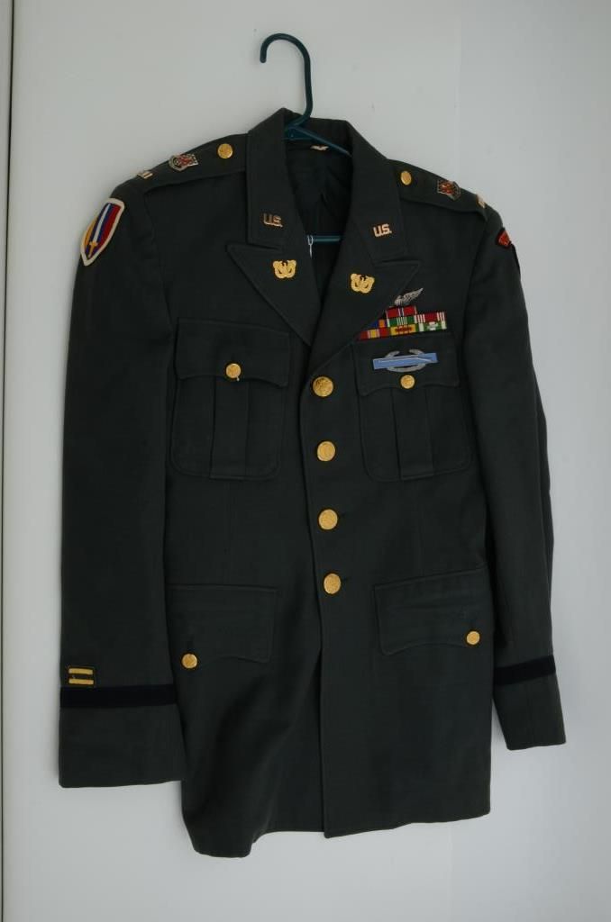 U.S. Army Uniform dress jacket, Helicopter Warrant Officer with wings, ribbons, patches and pins. Est.: $100-$150.