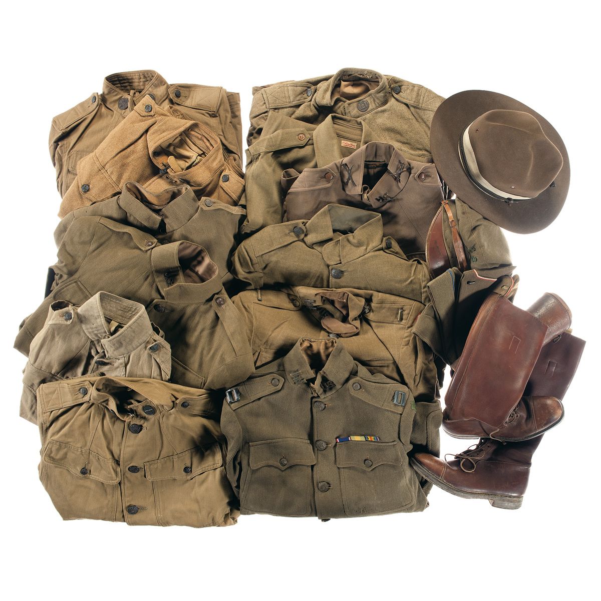 1 pair of leather boots, 1 belt, 1 stetson military hat, 1 green hat, 2 pair of leather leggings and 4 officers garrison caps. 13 WWI pattern jackets including 2 Lieutenants and 1 Captain.