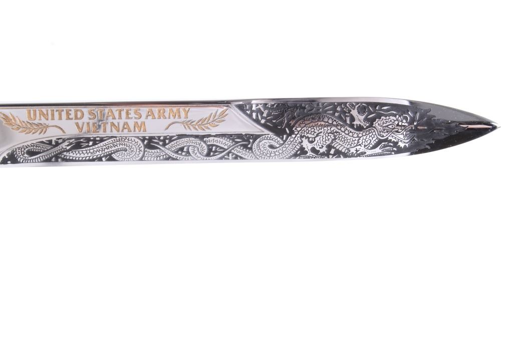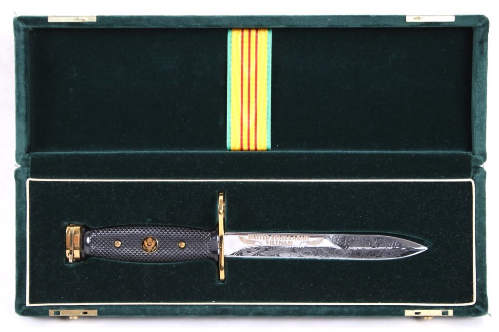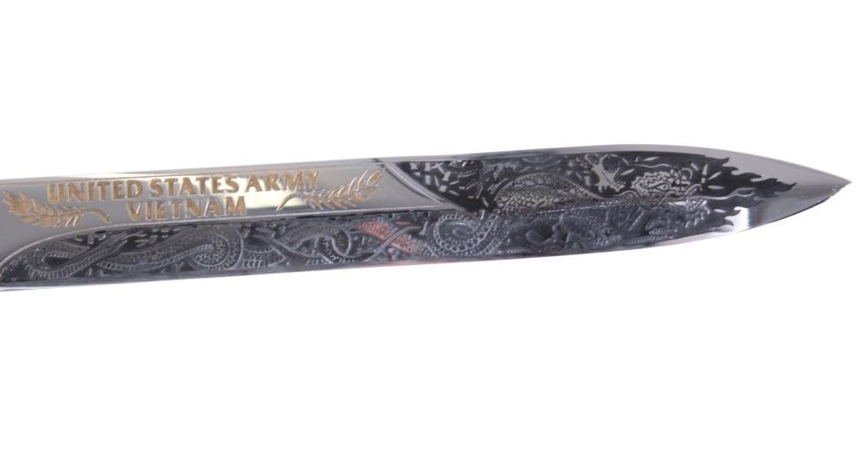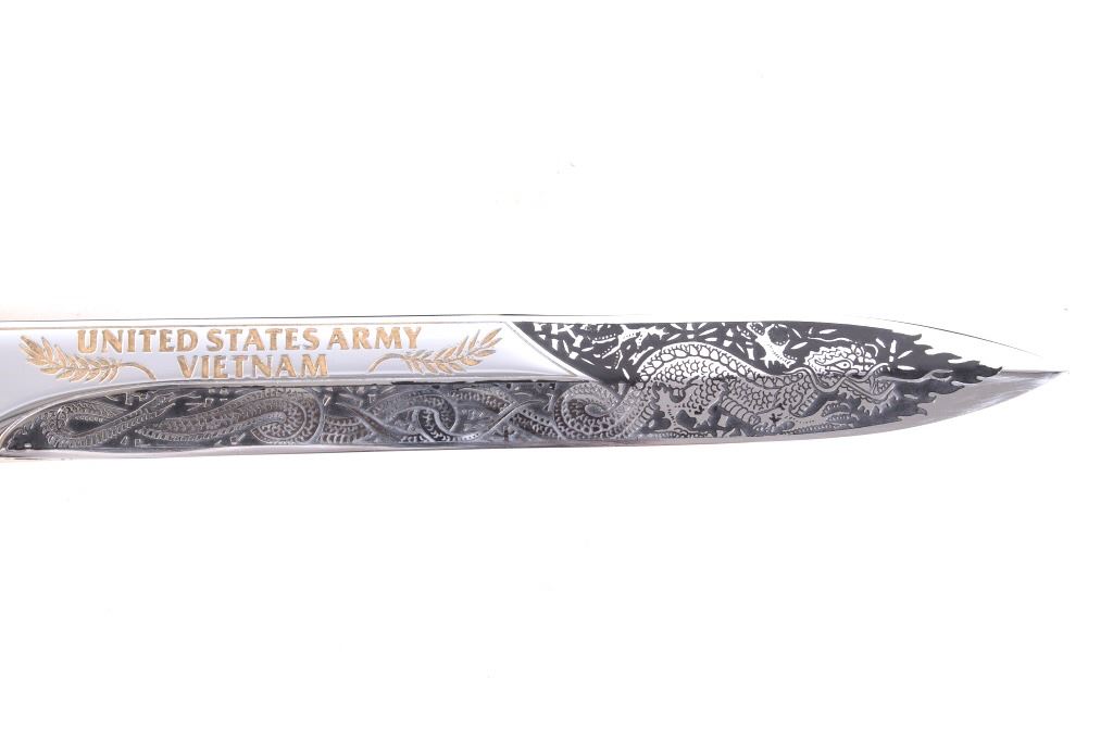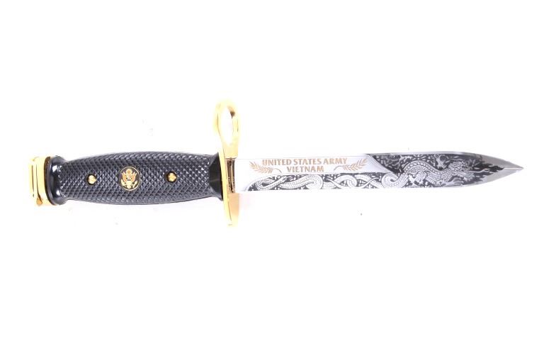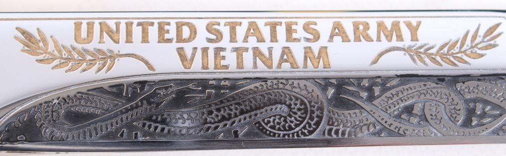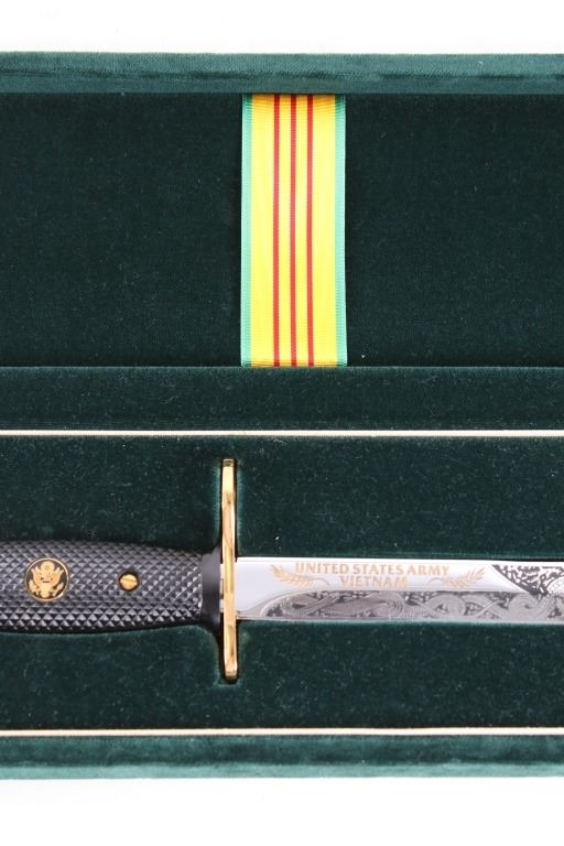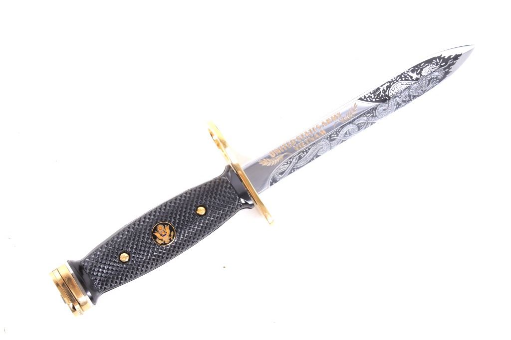 For your bidding pleasure is this U.S. Army Vietnam Commemorative M7 Bayonet. This is a Imperial Knife Company U.S. Army M7 "The Vietnam War Bayonets of Honor" Bayonet. "Issued by the American Historical Foundation to honor those Americans who answered the call to duty in Southeast Asia. This is the world's first collection of limited edition bayonets". This bayonet is in really good condition with no scratches, smudges, or patina; it has been extremely well taken care of and makes a great addition to military collectors or those wanting to commemorate our heroes in the United States Army during Vietnam. There are markings on the blade identifying it as an Imperial Knife Company M7 and also shows it is 1465 of 2500 with United States army Vietnam between two floral designs with a carbon decorated blade showing a dragon with a long body and a snake for its tail; the decoration is really well crafted and implemented to fit snug on the blade. The handle shows the United States Army Crest, with a release button at the very butt of the bayonet. The green felt display case is in good showing condition with slight patina to the buckles and hinge. The measurements of the bayonet is 11 5/8" long with a 6 1/2" long blade. The measurements of the display case are 2 1/4" x 15 1/8" x 4 3/4".