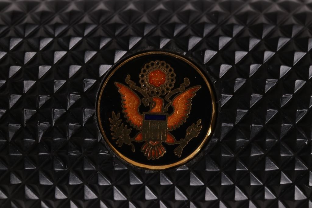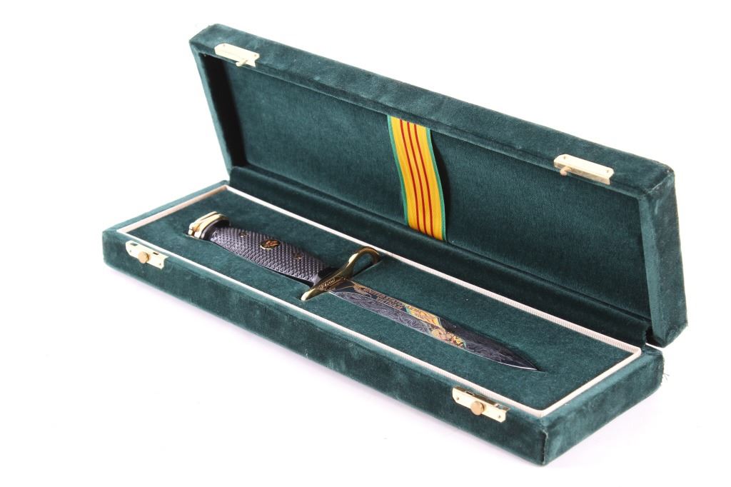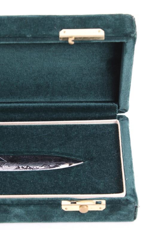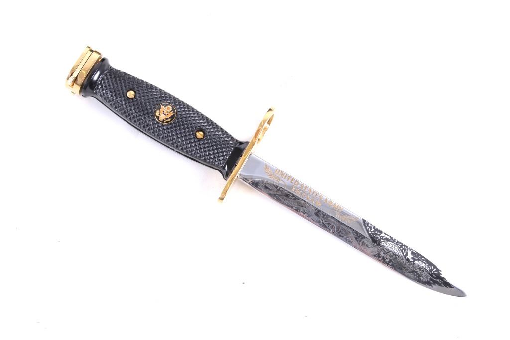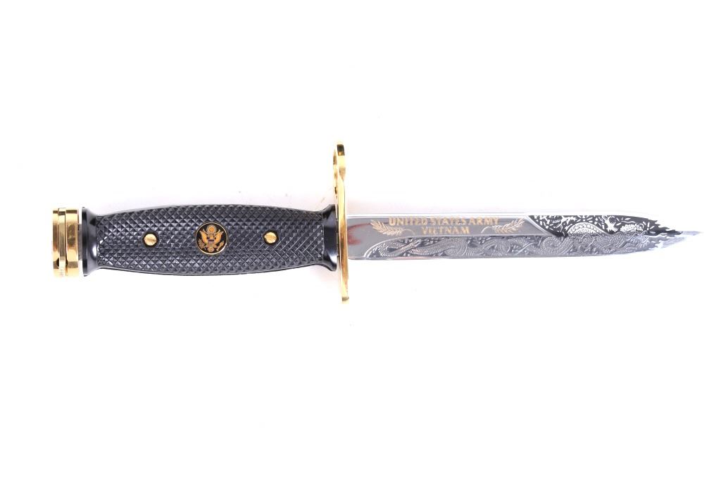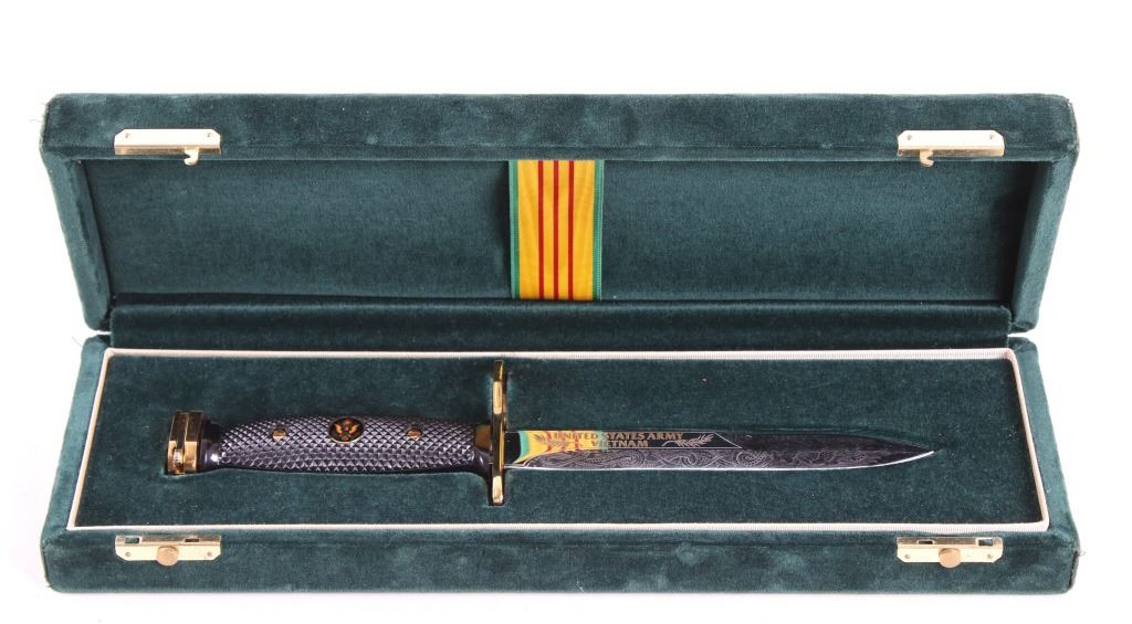 For your bidding pleasure is this U.S. Army Vietnam Commemorative M7 Bayonet. This is a Imperial Knife Company U.S. Army M7 "The Vietnam War Bayonets of Honor" Bayonet. "Issued by the American Historical Foundation to honor those Americans who answered the call to duty in Southeast Asia. This is the world's first collection of limited edition bayonets". This bayonet is in really good condition with no scratches, smudges, or patina; it has been extremely well taken care of and makes a great addition to military collectors or those wanting to commemorate our heroes in the United States Army during Vietnam. There are markings on the blade identifying it as an Imperial Knife Company M7 and also shows it is 1465 of 2500 with United States army Vietnam between two floral designs with a carbon decorated blade showing a dragon with a long body and a snake for its tail; the decoration is really well crafted and implemented to fit snug on the blade. The handle shows the United States Army Crest, with a release button at the very butt of the bayonet. The green felt display case is in good showing condition with slight patina to the buckles and hinge. The measurements of the bayonet is 11 5/8" long with a 6 1/2" long blade. The measurements of the display case are 2 1/4" x 15 1/8" x 4 3/4".