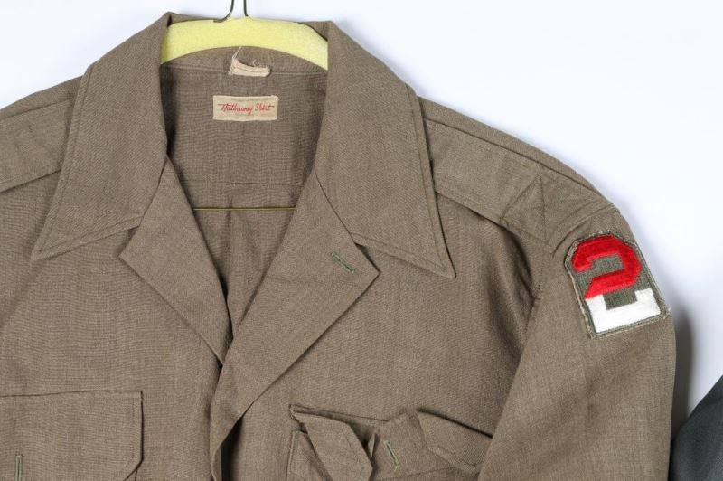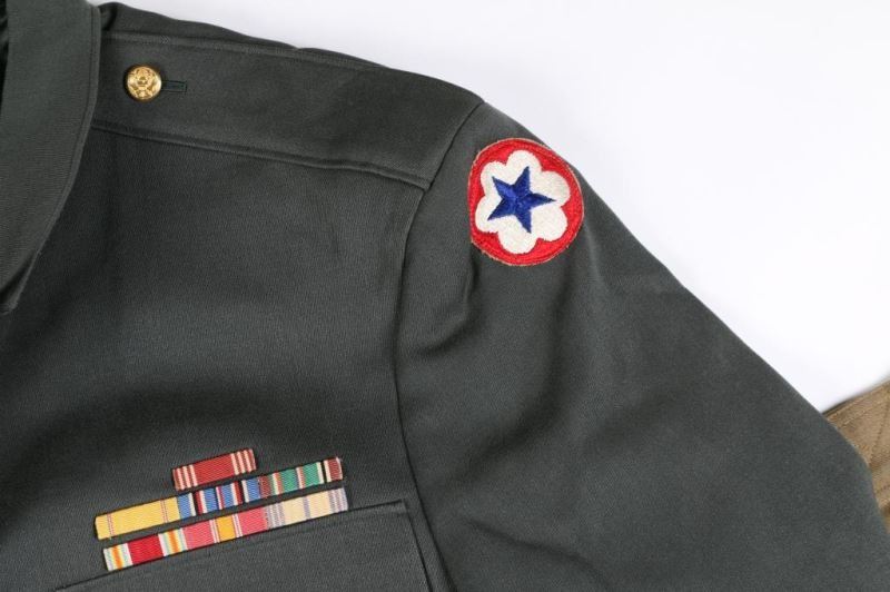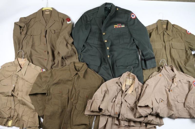 8 pieces. 4 WW2 Army shirts with "Military Staff Support defense" patches. (1942-46) One with H. Nakashima & Co. Osaka, Tokyo label. A post war Army dress jacket with same patch, 7 Sewn on Ribbons, Service bars. WW2 era ribbons. 3 WW2 Army shirts, one with 2nd Army patch, one plain, and one with PFC chevrons and "Viking" 47th Infantry division patch. All in good condition.
