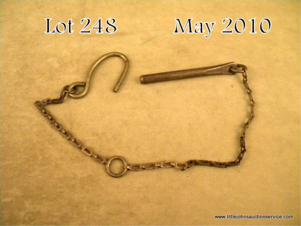 U.S. Army brass revolver storage device for hanging a Colt SAA cavalry model or Smith & Wesson Schofield in an armory or barracks setting; in overall very good condition with a pleasing dark patina. The device is a chain connecting a roundrod that fits into the barrel of the gun and a hook on the other end of the chain to support the frame; a ring in the middle of the chain would hang on a hook and the revolver would be suspended horizontally during times of storage. A greataccessory and used by the military from the Indian Wars period to WW I. Est.: $125-$250.