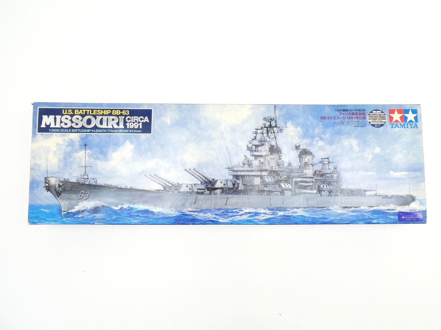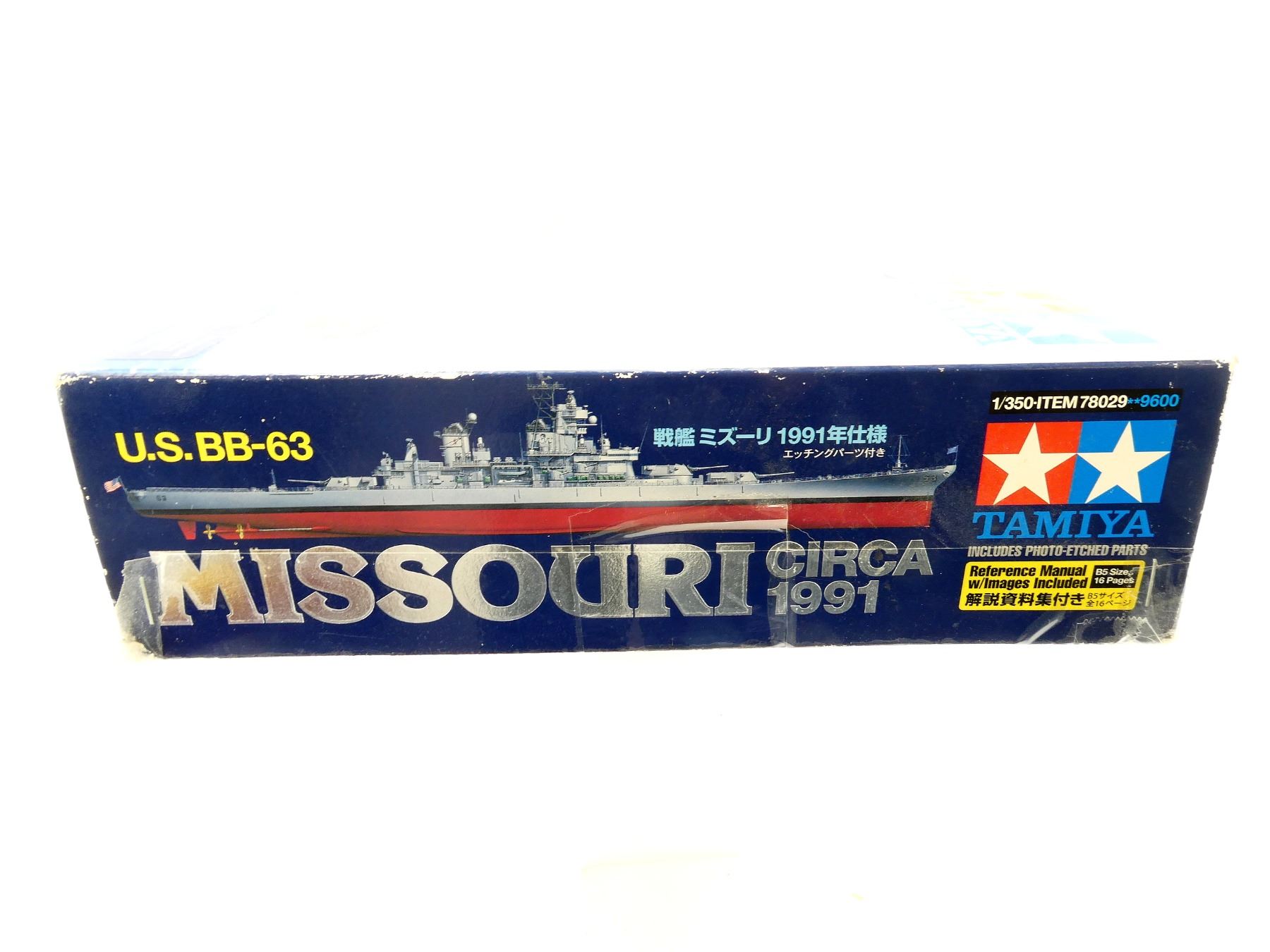(1) U.S. BATTLESHIP BB-63 MISSOURI MODEL KIT CIRCA 1991, 1/350TH SCALE BATTLESHIP IN ORIGINAL PACKAGING WITH INSTRUCTION MANUAL, APPEARS NOS, MAY NOT BE COMPLETE / PIECES MAY BE MISSING, LENGTH APPROX. 30.5" BEAM APPROX. 3.7". SEE PHOTOS.