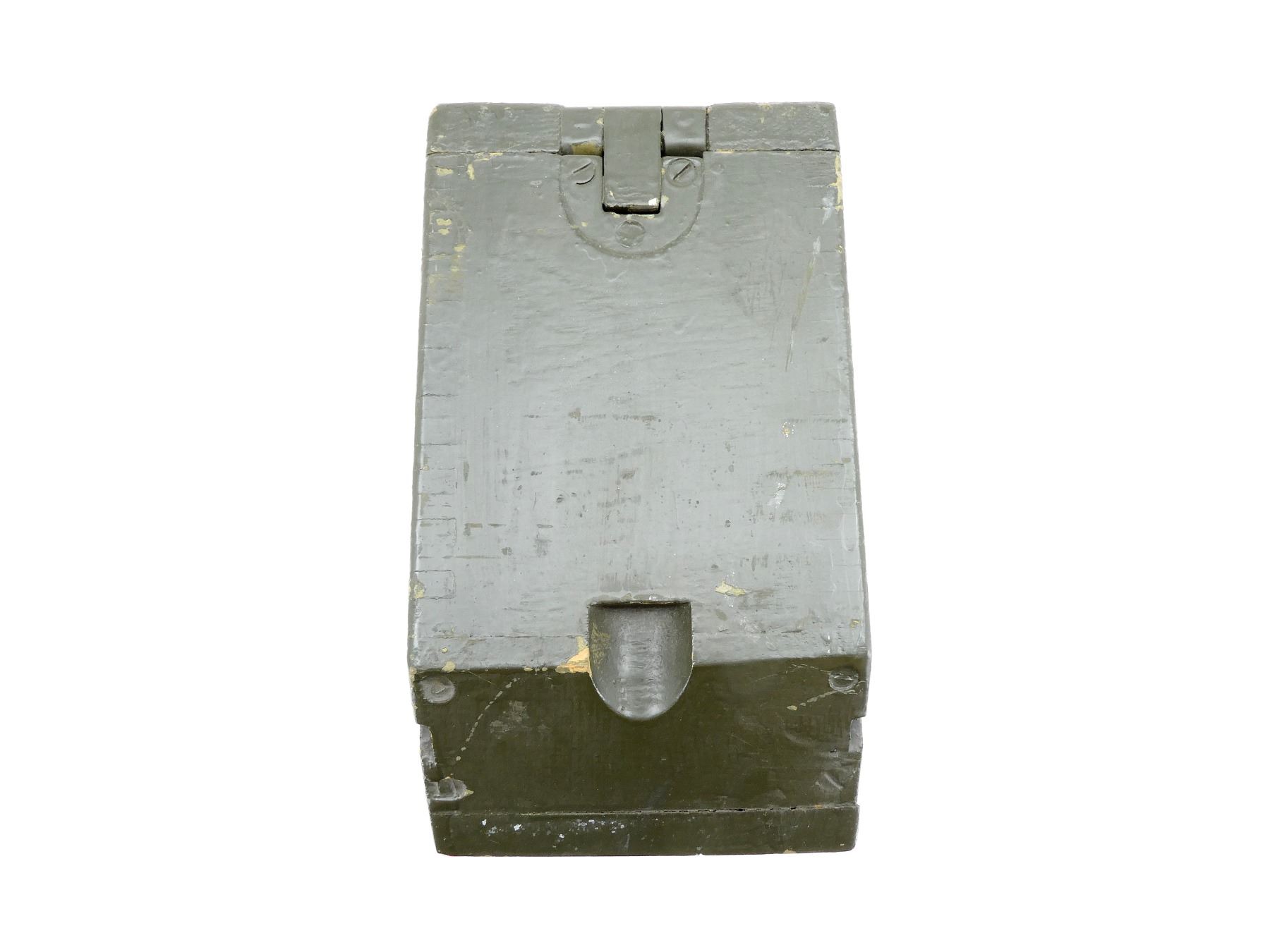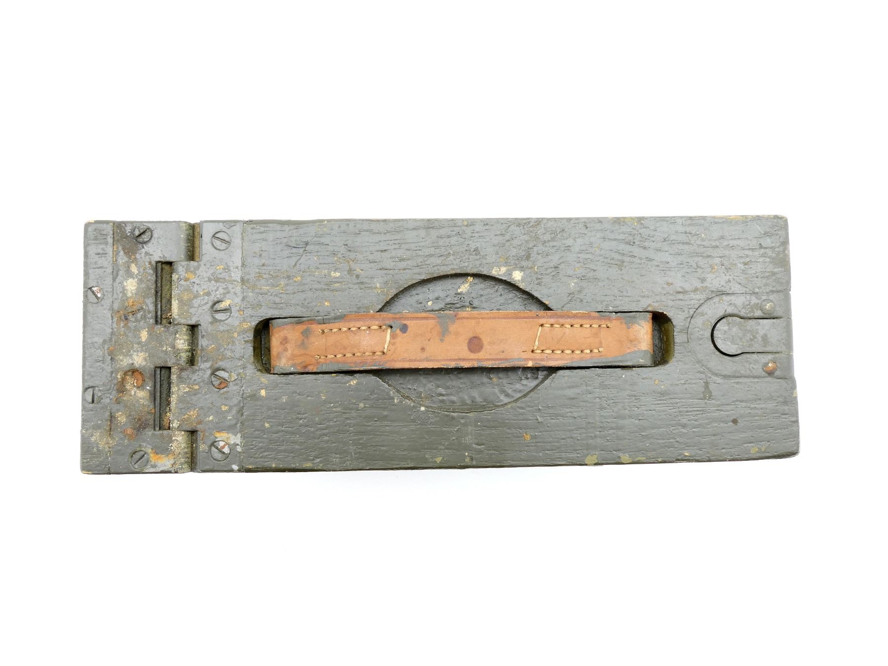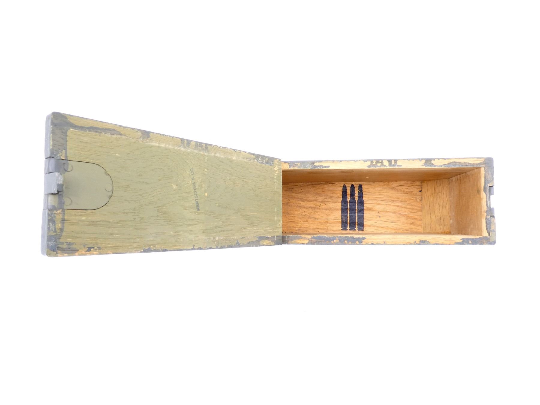 (1) FITS 1917 .30-06 CLOTH BELTS, GREEN PAINTED WOOD, LEATHER HANDLE, METAL HINGES / LATCH, LATCH WORKS, MARKED: "KERTSCHER & CO.", BULLET SHAPE STENCILED ON THE BASE OF THE BOX INSIDE, APPROX. 12.75" L X 4.5" W X 8" H. SEE PHOTOS.