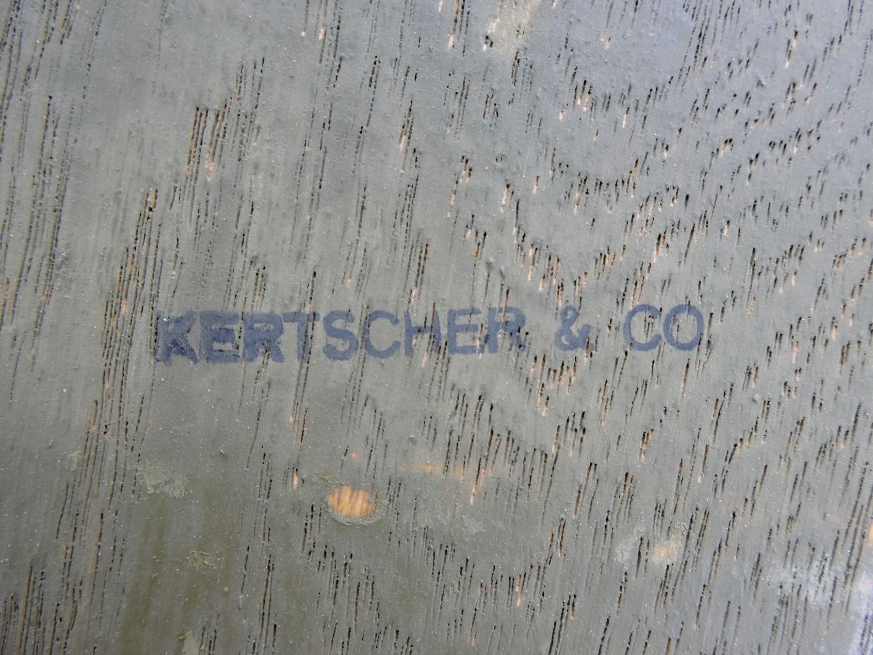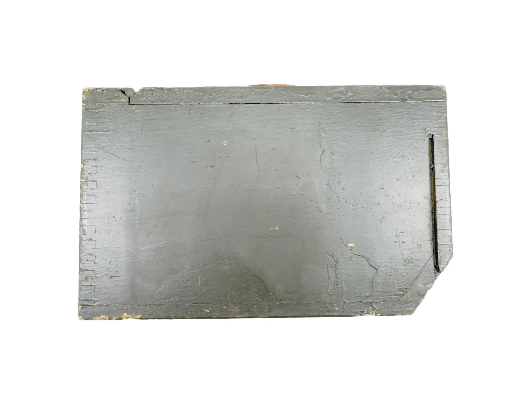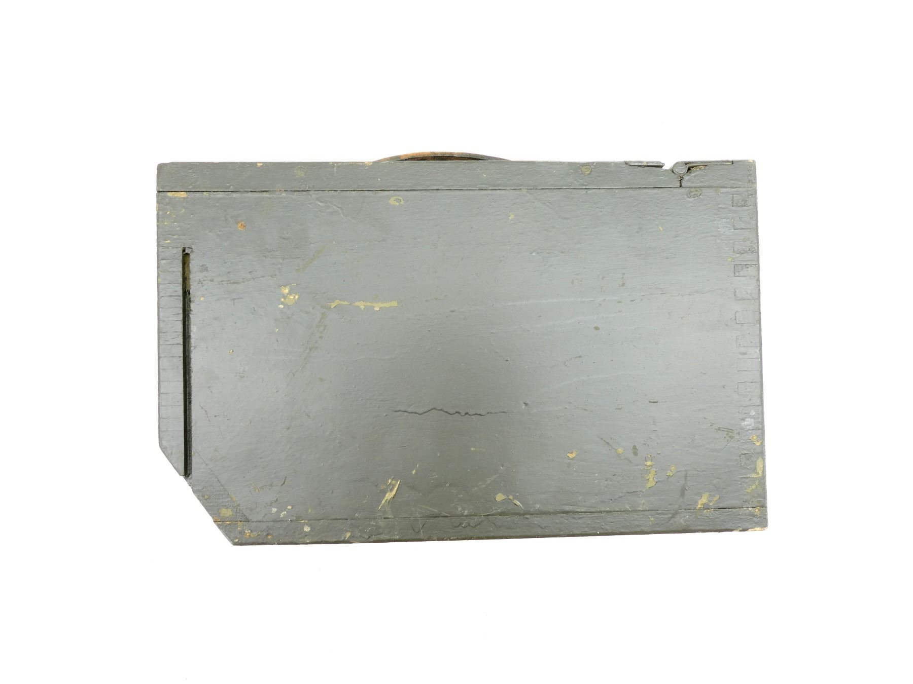 (1) FITS 1917 .30-06 CLOTH BELTS, GREEN PAINTED WOOD, LEATHER HANDLE, METAL HINGES / LATCH, LATCH WORKS, MARKED: "KERTSCHER & CO.", BULLET SHAPE STENCILED ON THE BASE OF THE BOX INSIDE, APPROX. 12.75" L X 4.5" W X 8" H. SEE PHOTOS.