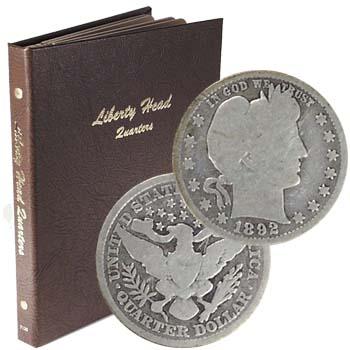 Charles E. Barber's Liberty Head was the last design to appear on three different U.S. coin denominations (the dime, quarter and half dollar). The U.S. Mint Chief Engraver, Barber spent several years perfecting this classical Libertyengraving. His Presidential Seal reverse is also greatly admired, adapted from an early U.S. Mint design. In their day, these 90% silver quarters could purchase a meal or buy a full gallon of paint. Quarter mintages today are generally over a hundred times higher than for this vintage series. There were never enough to go around, so most did yeoman's service in the economy. Our set includes all 25 dates in well-traveled Good quality, retaining basic designs and readablelettering. Custom album. 24.3mm