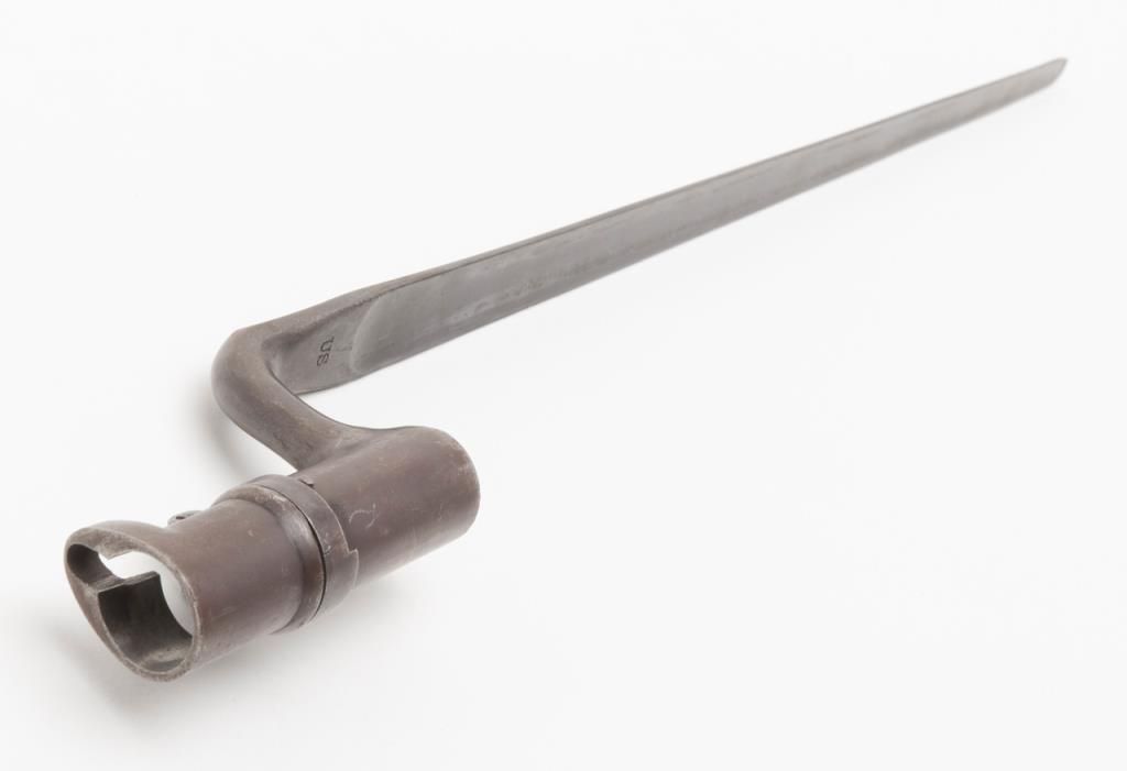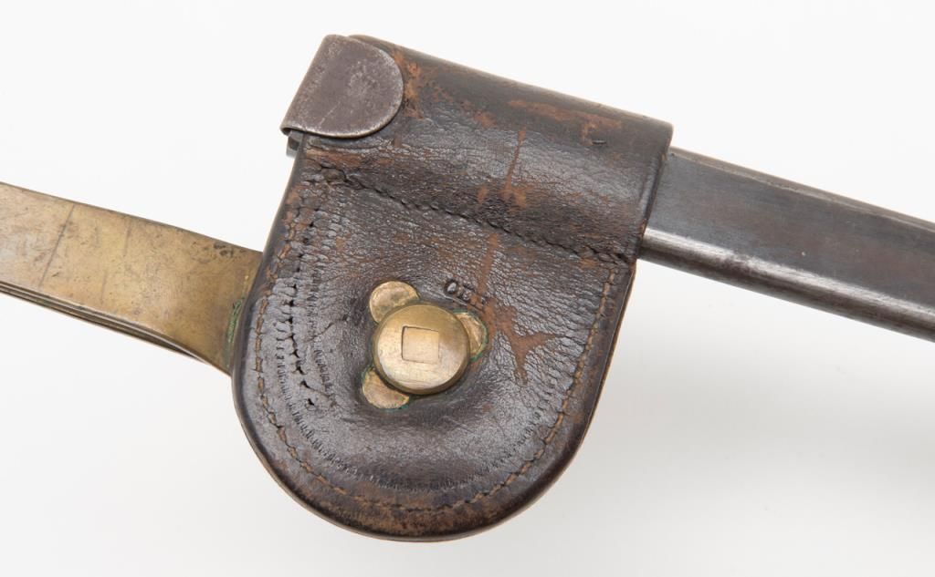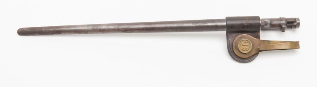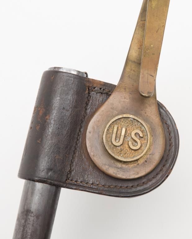 U.S. Bayonet for Trapdoor Carbine. The bayonet is in overall very good condition with 18” US marked blade that retains a significant amount of its blued finish. The bayonet comes with leather frog and U.S. marked brass hanger. Est.: $100-$150.