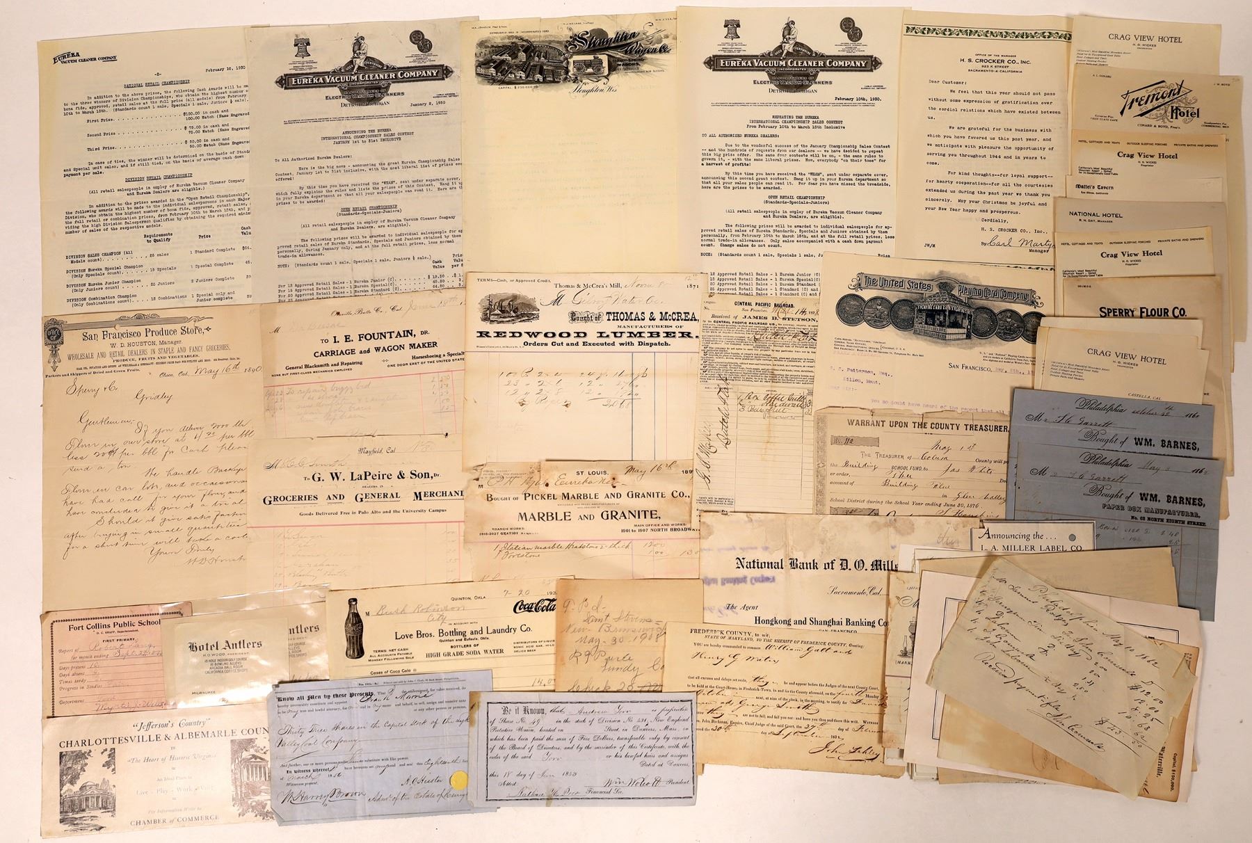 Lot of over forty pieces of ephemera, mostly billheads, including 1898 U.S. Playing Card Co. and 1878 Jas. B. Stetson. 1871 Thomas & McCrea Redwood Lumber Co.