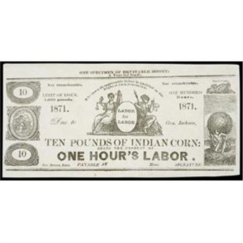 "One Specimen of Equitable Money: A Text for Study," "Gen. Jackson," Political Note, Choice Crisp About Uncirculated. A very unusual, dated 1871 this Political note is an attack on labor policies in the early 1870s. At the center is a large vignette of a seated Justice and Athena flanking "Labor for Labor." Below, the slogan "Ten Pounds of Indian Corn being the product of One Hour's Labor." At the right is Atlas and at the left is a vignette copied off a Louisiana state bill. Printed on a translucent paper. The wide margin at the top has the title, most likely meant to be trimmed away. In the upper right corner the tiny vignette of a pocket watch and the legend "Time is Wealth". The first of this historic note we have offered in our auctions. Very rare.