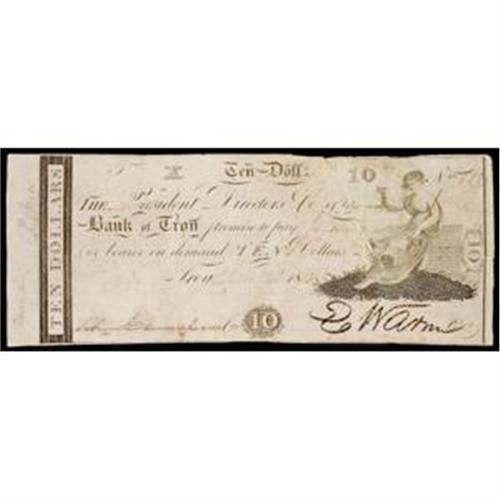 Haxby NY-2730 C96. An early 1812 dated counterfeit. At the upper right Justice is seated with her blindfold and holding scales. A 2" tear with a heavy tape stain at the upper right.