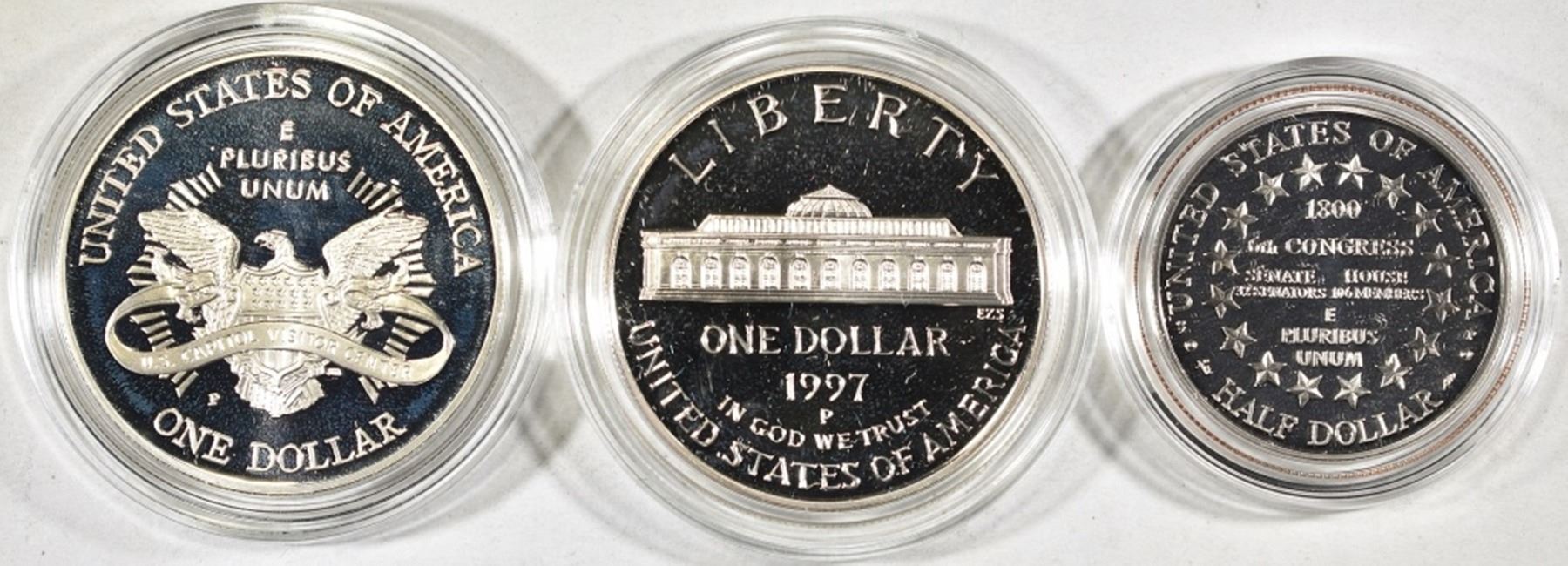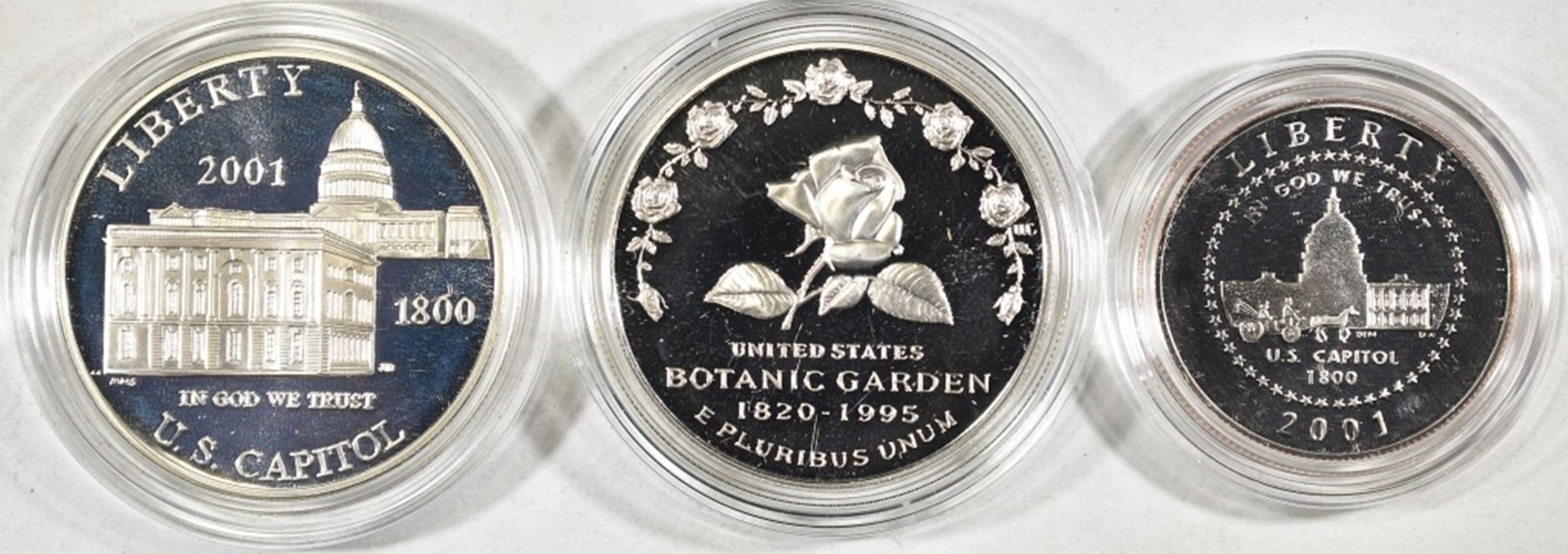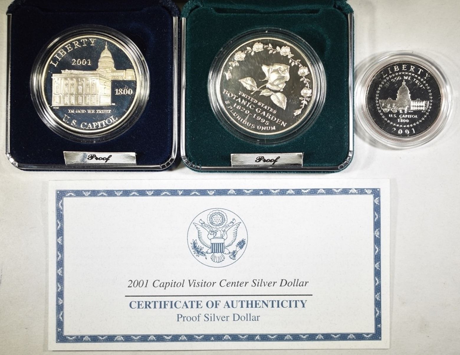 2001 CAPITOL VISITOR CENTER PF HALF DOLLAR, NO COA, 2001 U.S. CAPITOL VISITOR CENTER PF SILVER DOLLAR NO SLEEVE, 1997 BOTANIC GARDENS PF SILVER DOLLAR NO COA. ESTIMATE $100 - $120.