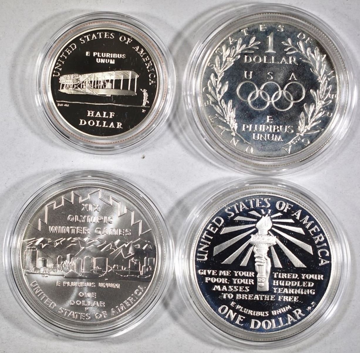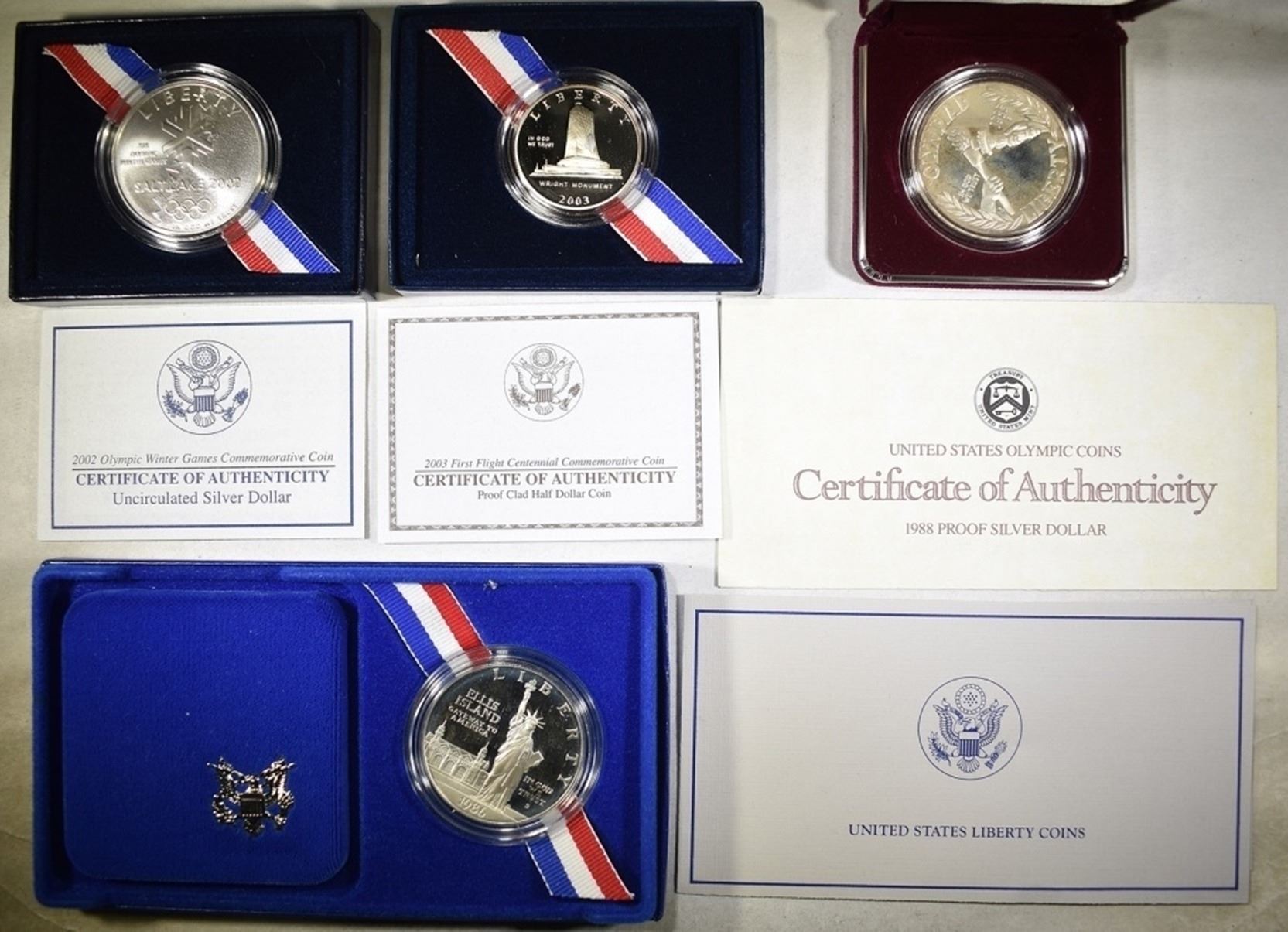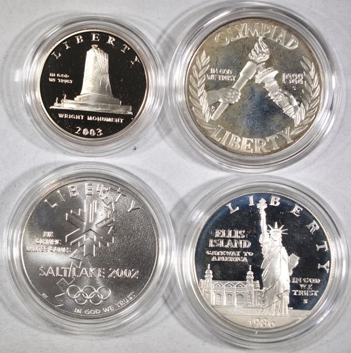 1986 PROOF STATUE OF LIBERTY DOLLAR, 2002 UNC SALT LAKE CITY OLYMPIC DOLLAR, 1988 OLYMPIC PROOF SILVER DOLLAR & 2002 FIRST FLIGHT PROOF HALF DOLLAR ESTIMATE $100 - $120.