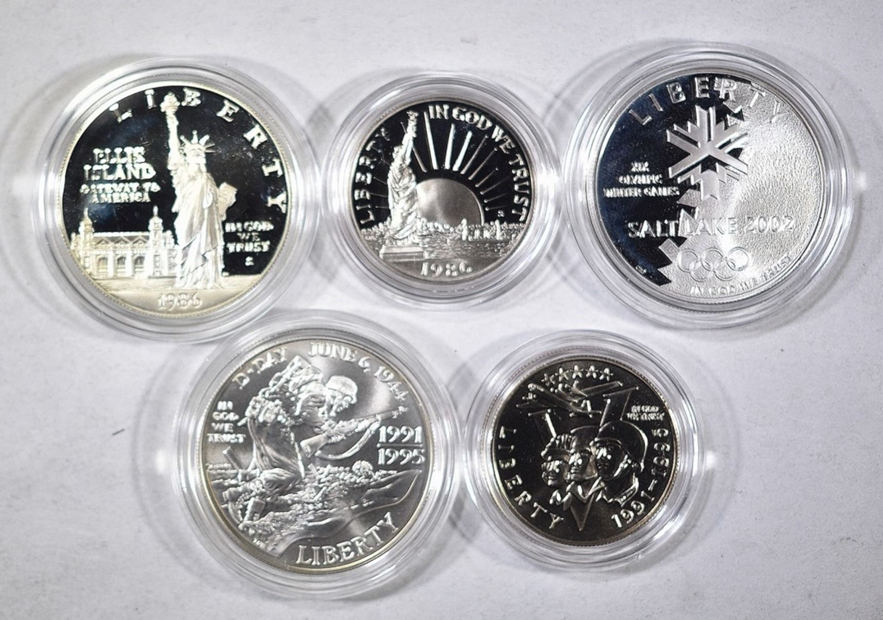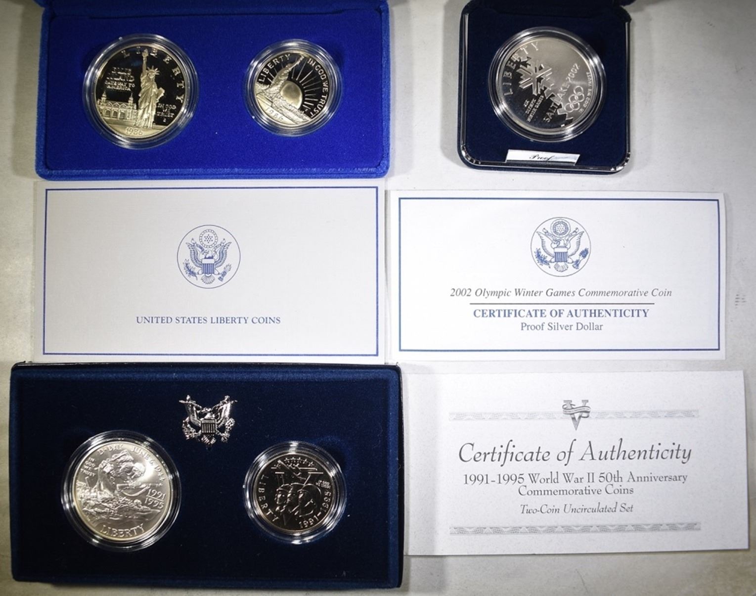 2002 SALT LAKE OLYMPICS PROOF DOLLAR, 1986 STATUE OF LIBERTY 2-COIN PROOF SET & 1993 WWII UNC 2-COIN SET ESTIMATE $85 - $100.