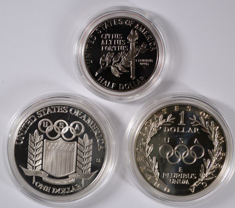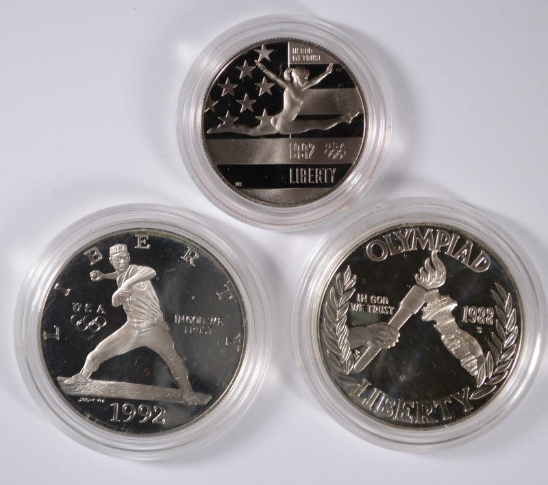 U.S. COMMEMS IN CAPSULES, 1992 OLYMPIC HALF DOLLAR, 1988 & 1992 OLYMPIC DOLLARS
