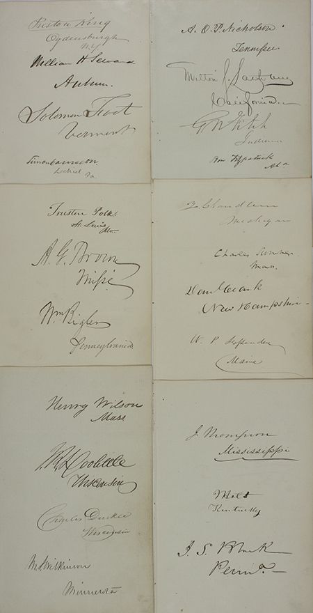 A collection of 42 signatures of Members of Congress from 1860, executed on album pages with some bearing multiple signatures but easily divided if necessary. Includes: WILLIAM SEWARD, ANTHONY KENNEDY, PRESTON KING, SOLOMON FOOT, JAMES HARLAN, HENRY WILSON, CHARLES SUMNER, ZACHARIAH CHANDLER, WILLIAM P. FESSENDEN, HANNIBAL HAMLIN, LYMAN TRUMBULL, JOHN J. CRITTENDEN, JAMES ALFRED PEARCE, CHARLES DURKEE, TRISTEN POLK, JAMES S. GREEN, JOHN P. HALE, J. H. HAMMOND, HENRY M. RICE and more. Very good condition, a great dealers lot.