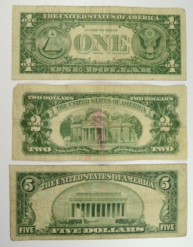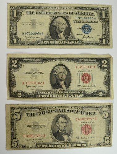U.S. CURRENCY LOT: 4 $1.00 SILVER CERTS , 4 $2.00 AND 6 $5.00 RED SEAL NOTES