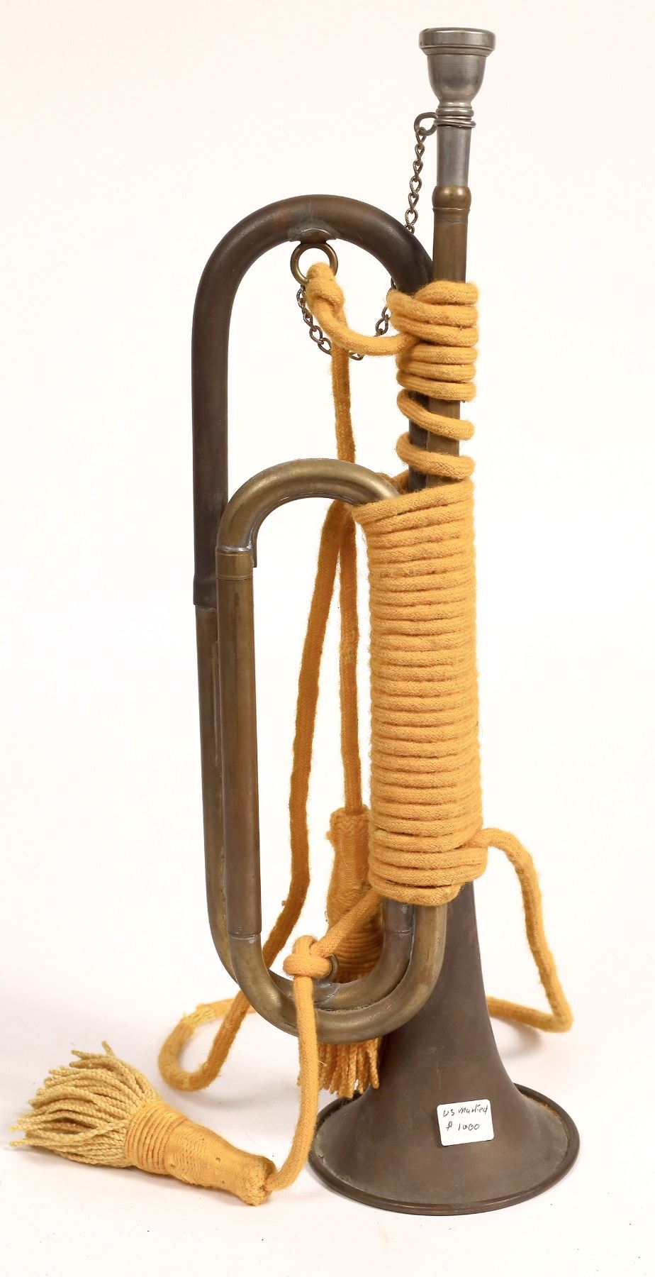 This is an original bugle for the US Cavalry made by Conn instruments. It is 15 in. long without the mouthpiece. Made of brass and copper. It is marked "CONN /US" on the bell. Overall very good condition with gold cordage. c. 1880-1890's. c.1880's-1890's Jim & Barbara Sherman Private Western Mining Museum