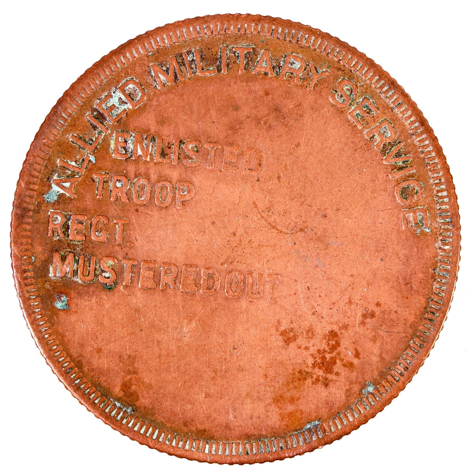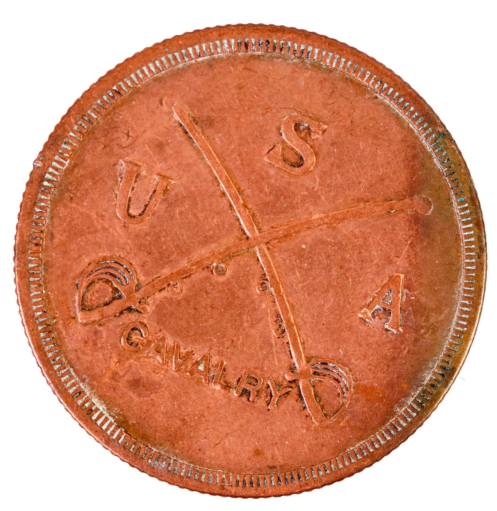 Rare copper U S A Cavalry obverse with crossed swords. Reverse: Allied Military Service / Enlisted / Troop / Regtr. / Mustered Out. Rd., 35 mm.