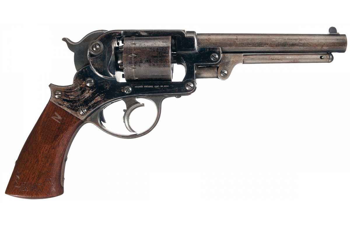 This is an example of a U.S. martially inspected Starr Model 1858 DA Revolver. The frame has the New York address on the left side and the 1856 patent date on the right side. Most of the components have single letter inspector marks. An anchor is stamped below the barrel lug serial number. Matching numbers on the barrel lug, hammer well and hammer. The revolver is fitted with a one piece grip featuring a clear cartouche on the lower left and right side.