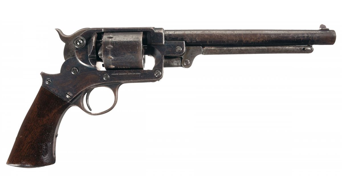 Manufactured between 1863 and 1865, approximately 25,000 Model 1863 revolvers were purchased by the U.S. Government. The left side of the frame is marked with the one line address and the right side has the one line patent date. The inspector letter "M" is marked on most major components. The matching serial number is marked on the front of the frame, bottom of the barrel, on the cylinder and in the hammer cut out. Dovetailed blade front and hammer notch rear sights, blue finish with casehardened hammer and loading lever, and fitted with a smooth one-piece walnut grip with a visible cartouche on the lower right side.