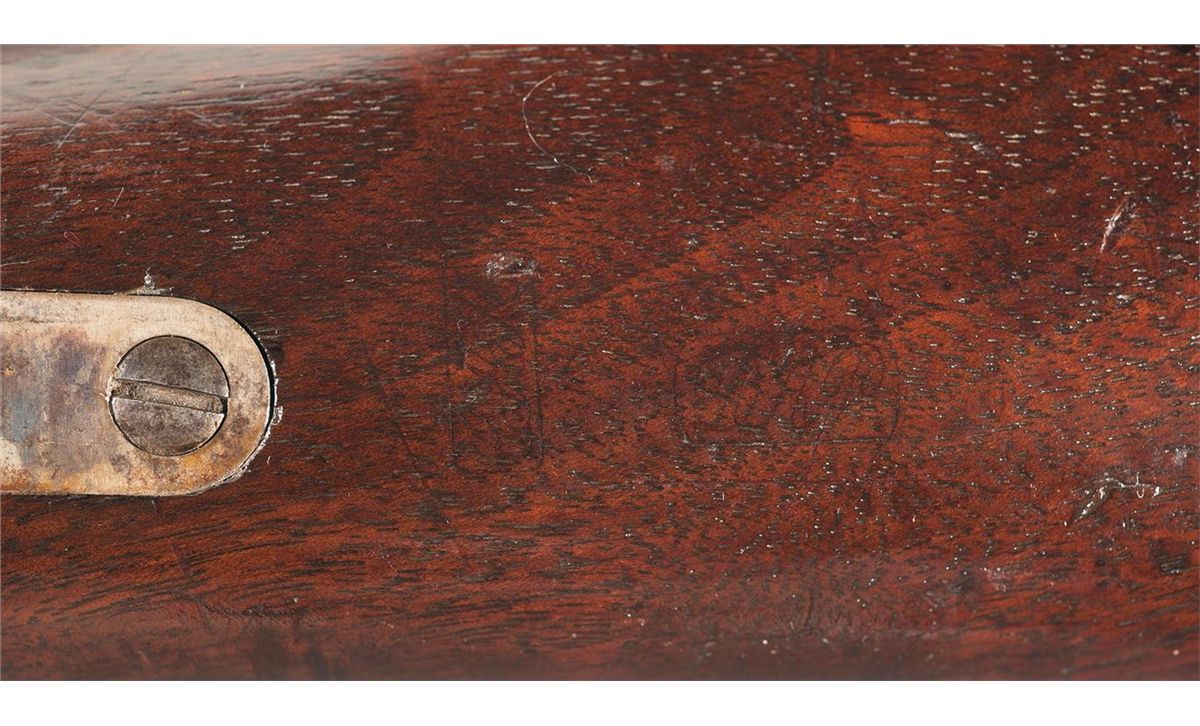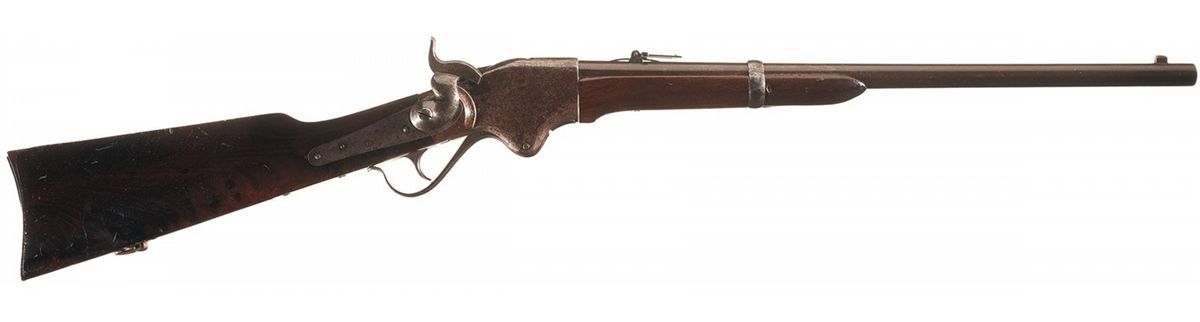 Manufactured from 1863 to 1865, the Spencer Carbine was one of the most popular firearms used by the Union forces in the Civil War. Blade front sight, ladder rear sight adjustable to 800 yards and saddle ring bar with ring. The top of the receiver has the Spencer address and patent marking with the serial number on the upper rear. Smooth forearm and straight grip stock with a single barrel band, two script cartouches on the left side of the wrist and a sling swivel on the buttstock.