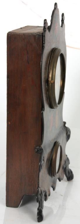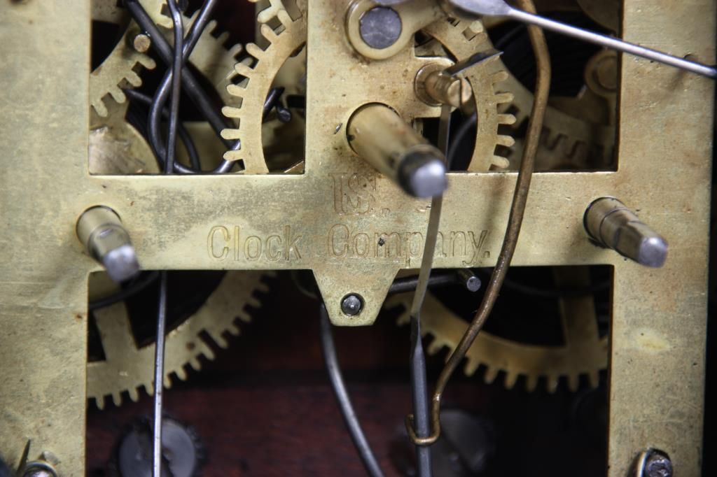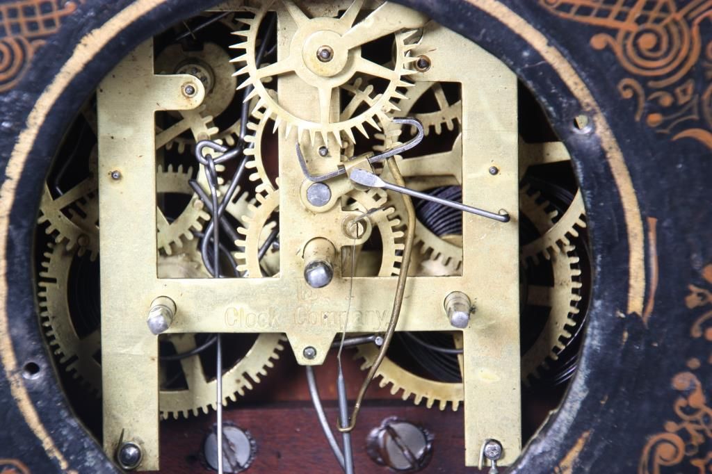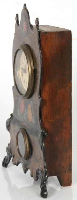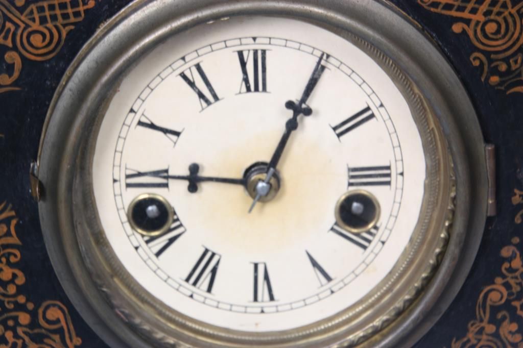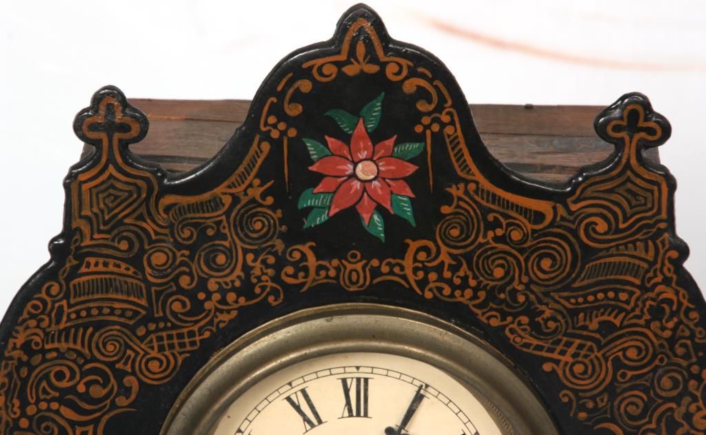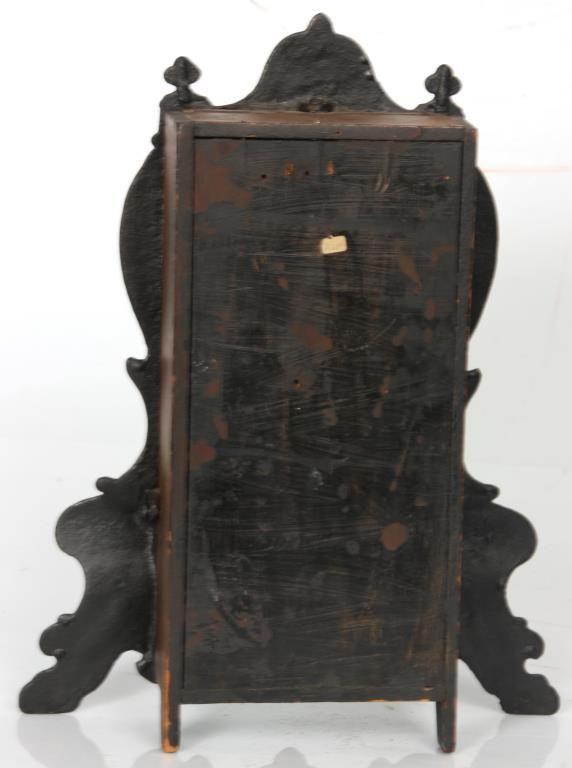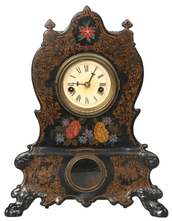 U.S. Clock Co. Iron Front Shelf Clock. 3 in. paper dial with black Roman hour numerals and black hands; brass spring driven movement is signed U.S. Clock Co., has an half hour coiled gong strike, missing pendulum. Case has an iron front with fancy painted floral design, black background and tan highlights; signed with an original paper label in the back of the case. Case front is repainted. 15 in. high x 12 in. wide x 4 in. deep.