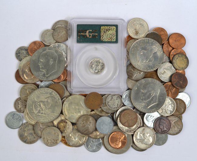 Wide assortment of mostly base metal U.S. coins, mainly 20th century. There is a smattering of 90% silver and a few earlier type coins. Well over 150 coins. Fair to uncirculated.