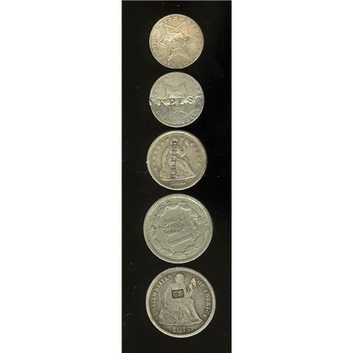 <B>U.S. Coin Counterstamped Group Lot.</B></I> Two scarce three cent silvers, a nickel three cent piece, a silver half dime and a Seated dime: 1852 silver three cent counterstamped O. Kelso, AU; 1856 silver three cents counterstamped Baker; 1867 three cent nickel counterstamped Mf'd by L.H. Sanderson 66 Nassau St. NY; 1856 Seated half dime counterstamped R.D. King; and an 1875 Seated Liberty dime counterstamped Crown over 18, this could be a jeweler's mark. Market value is about $175-$275.<BR><BR><b>Shipping:</b> Coins & Currency (<a target="_blank" href="http://www.heritageauctions.com/common/shipping.php">view shipping information</a>)