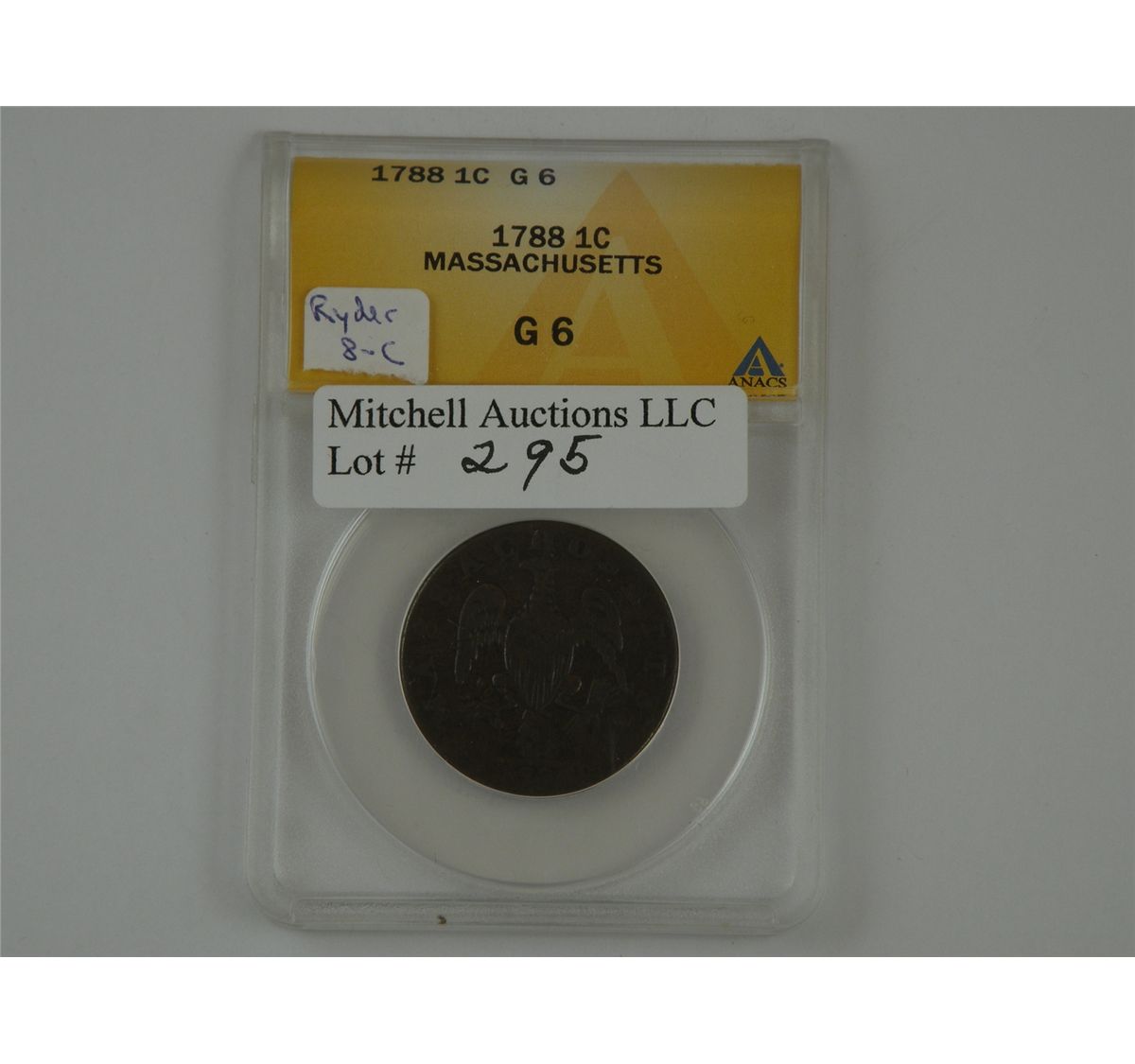 U.S. Colonial. 1788 Massachusetts Cent. Ryder 8-C, No Period after MASSACHUSETTS. ANACS Good-6. Noticeable flaws and weakness on the reverse. Est.$50