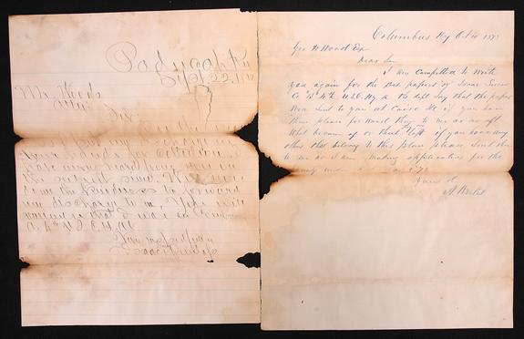 U.S. Colored Troops Apply For A Pension. Two Kentucky letters written to attorney George Woods in 1872 and 1873, pertaining to pension applications for former members of the U.S. Colored Troops: Isaac Lucas, Co "B" 4th U.S.C. Hy. and Isaac Dunlap, Co. "A" 4th U.S.C.H.A.C. Both documents are torn and stained.