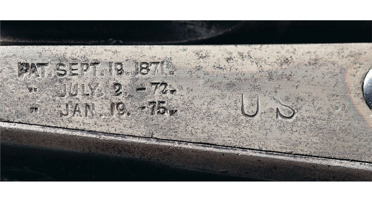 From 1895 to 1903 a number of "US" marked Single Action Army revolvers, like this one, were returned to either the Colt factory or Springfield Armory where they were modified (to 5 1/2 inch barrel length), dismantled and refinished, often with little regard to which gun the refinished parts came from, resulting in a mix of serial numbers and markings. This revolver has a 5 1/2 inch barrel, casehardened frame and hammer and blue remaining parts. The serial numbers are mixed on these altered models and they were remarked by inspectors of the era. This revolver is serial numbered "50422" on the frame, "18703/C" on the trigger guard, "18703" on the back strap and "9465" on the cylinder. It bears the standard one line address on top of the barrel, "P" twice marked on the bottom of the barrel and the three line, three patent date marking on the left side of the frame followed by "U.S.". "HN", stamped on the bottom of the frame above the serial number and on the cylinder. The loading gate is marked with the assembly number "1882". It has the standard blade front and frame notch rear sights and is fitted with the correct smooth one-piece walnut grip with "1903" stamped above a visible cartouche on the right side and marked "R.A.C." on both sides of the bottom.