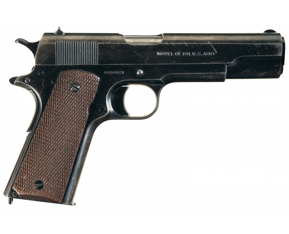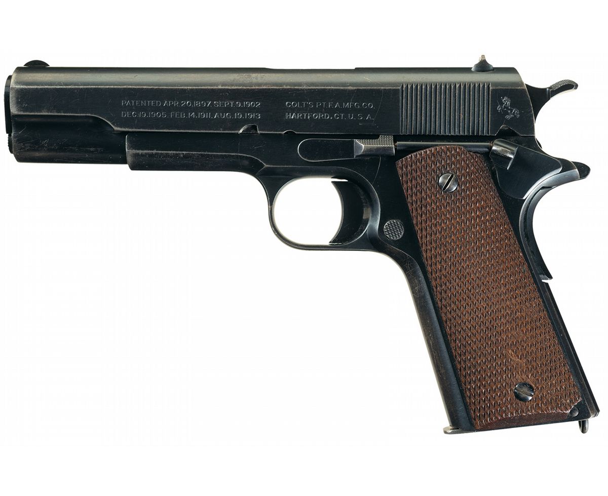 Manufactured in 1918 and subsequently sent to the factory to be refinished. Fixed sights, with the two line, two block Colt patents and address on the left side of the slide, the Rampant Colt behind the serrations, and "MODEL OF 1911.U.S. ARMY" on the right. The trigger guard is stamped "K", and no other external proofs/inspection marks. Fitted with a long smooth trigger, flat top rear sight, wide checkered hammer, short grip safety, checkered slide stop and thumb safety and flat mainspring housing with lanyard staple. Fully checkered hardwood grips with an unmarked magazine and a "S" marked barrel. A brown canvas magazine pouch, marked "L.C.C.&CO.1918" and "L.C.C./70" inside the flap, is included