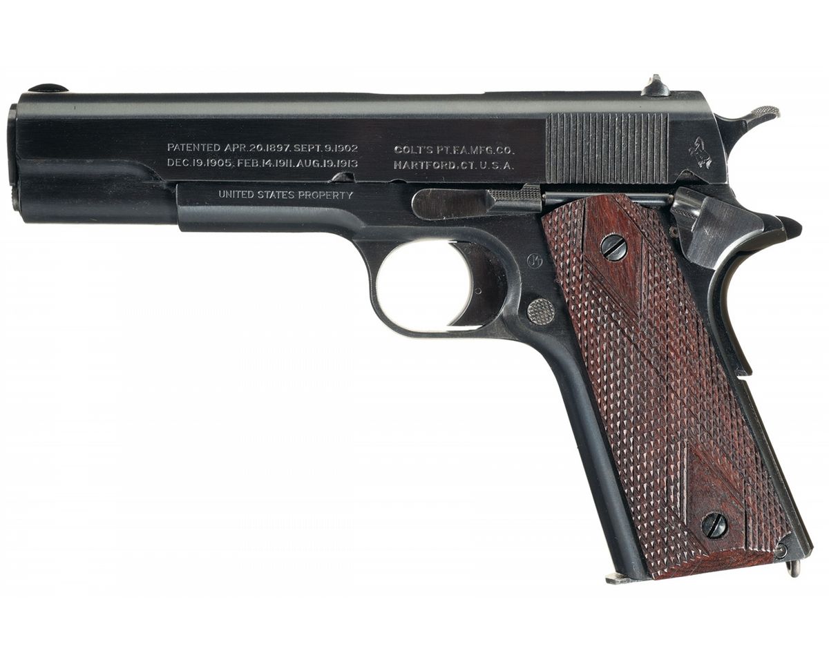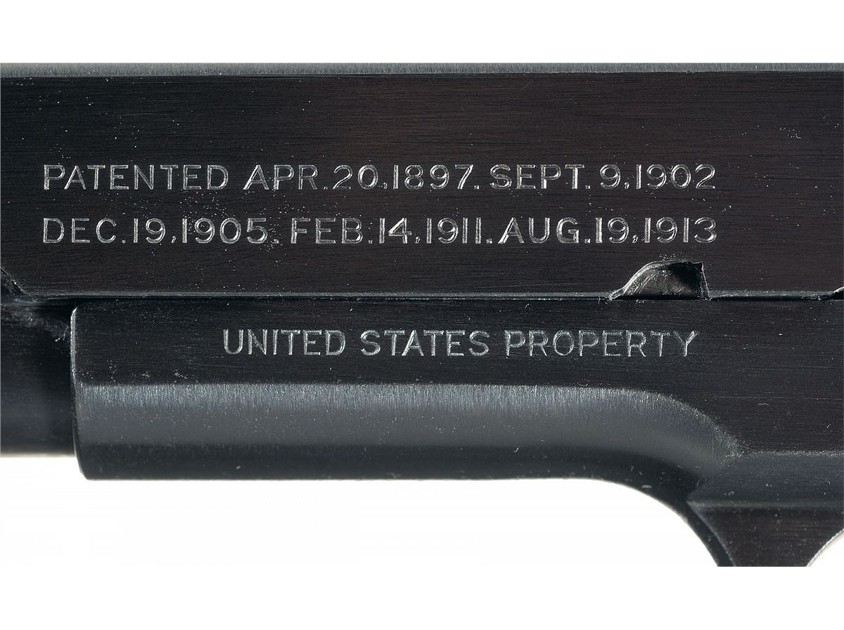 Manufactured in 1918, this pistol is one of 3,900 shipped to Springfield Armory on March 27, 1918. The left side of the slide is marked with the two line, two block 1897-1913 patent dates and address, with the Rampant Colt behind the serrations, the left side of the frame is marked "UNITED STATES PROPERTY", and "MODEL OF 1911.U.S.ARMY" is marked on the right side of the slide. The right side of the frame is marked with the serial number and the left side is marked with the circle "JMG" inspection mark of Major John M. Gibert. The barrel chamber is marked with an "H" and "P" and the rear of the slide is marked with the letter "H" above the firing pin. Fixed sights, lanyard ring on the heel, unmarked two tone magazine and fitted with checkered walnut grips with diamond around the screws.
