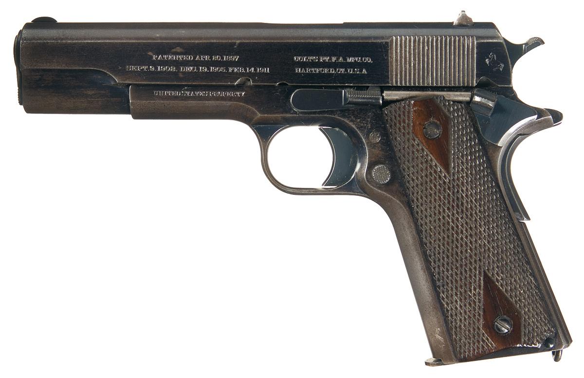 Produced in 1914. Fixed sights, with the two line Colt patent dates, Hartford address and Rampant Colt on the left side of the slide, "H" over the firing pin and "MODEL OF 1911.U.S.ARMY" on the right. The frame is marked "UNITED STATES PROPERTY" on the left side, ahead of the Penfield "WGP" inspection mark. Equipped with a wide checkered hammer, short grip safety, long smooth trigger, checkered hardwood grips and a High Standard barrel.