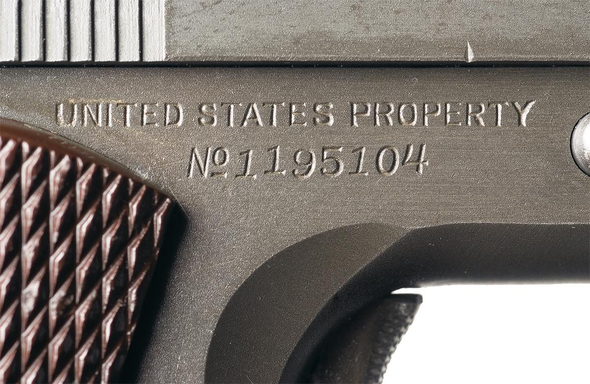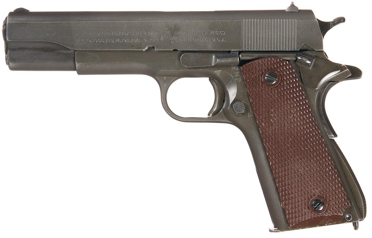 Produced in 1943. Fixed sights, with the two line, two block address/patent marking with the Rampant Colt in the center on the left side of the slide and "P" on top. The frame is marked with the "G.H.D" inspection stamp, "1/ VP" on the trigger guard, and "No" style serial number. Fitted with a checkered wide hammer spur, stamped trigger, checkered slide stop and thumb safety, long grip safety, arched checkered mainspring housing and late war style Colt wood grips. Colt barrel, marked "COLT .45 AUTO" on the left side of the chamber and "P" on the lug. With a brown leather "SEARS/ 1943" U.S. shoulder holster with straps, a pair of clear acrylic grips with finger grooves, and a magazine and slide assembly for a Colt Service Model Ace pistol.
