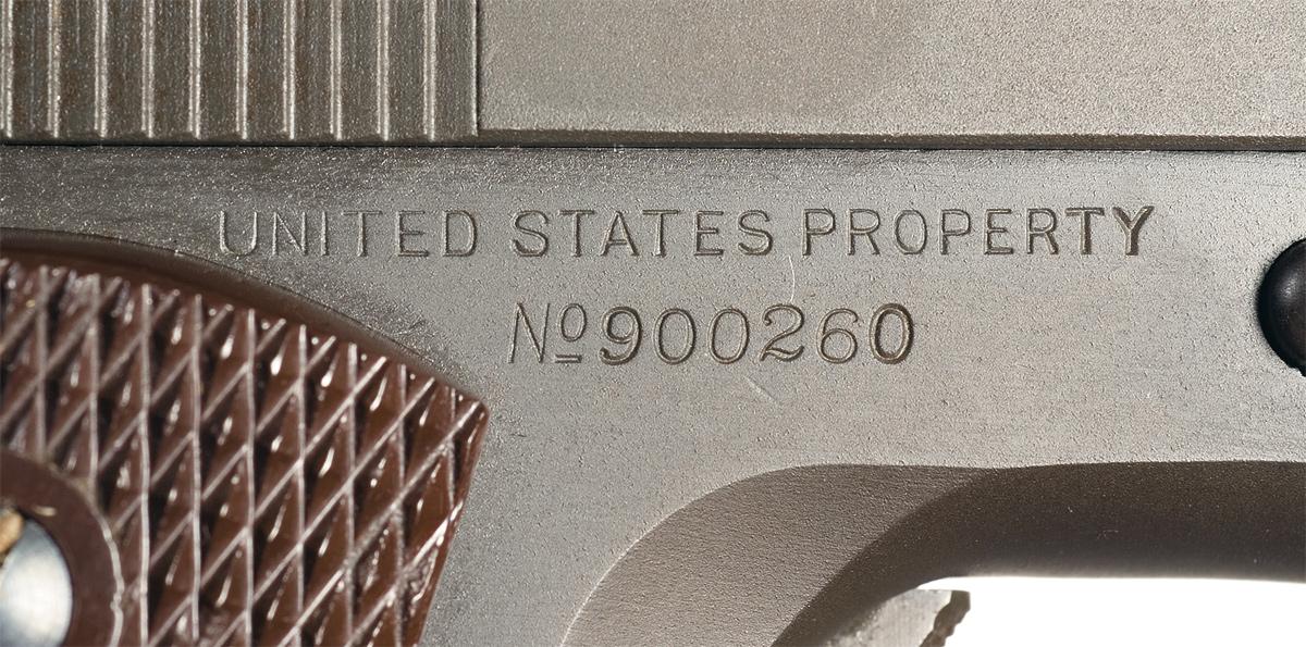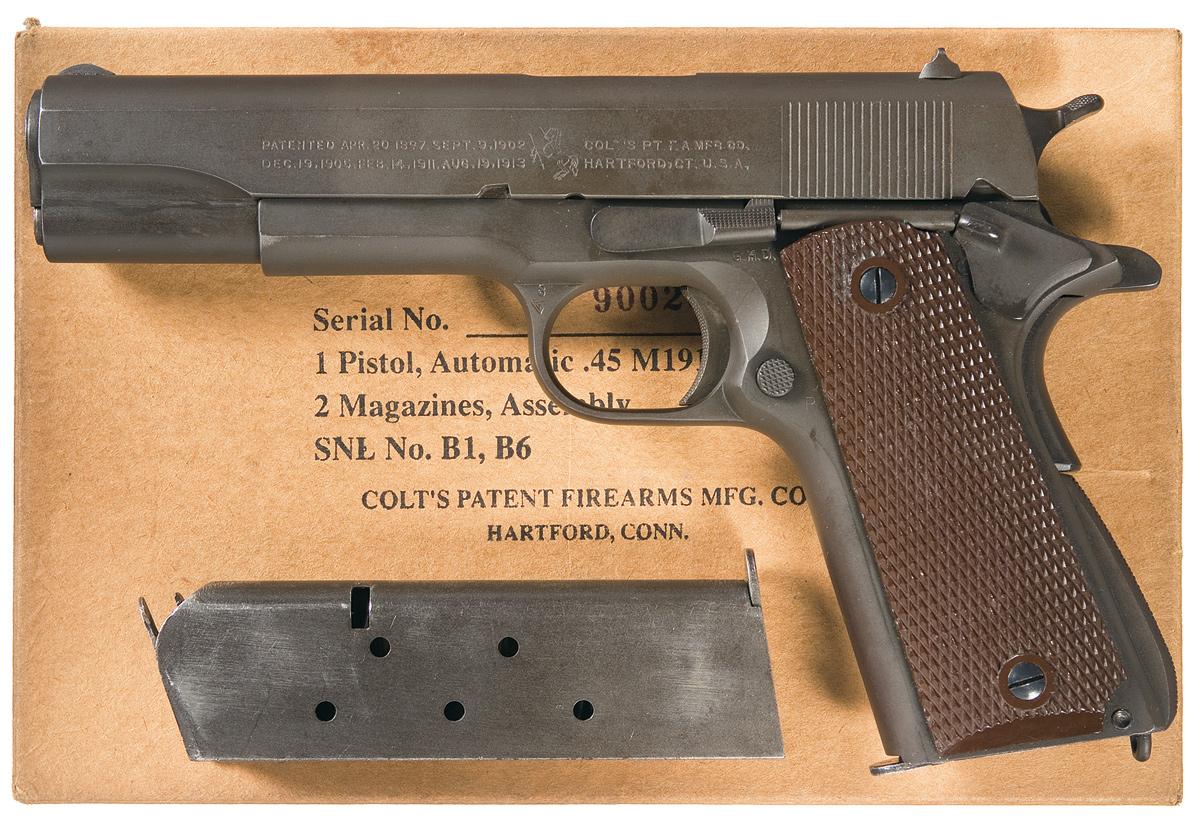 Produced in 1943. Fixed sights, with the two line, two block address/patent marking with the Rampant Colt in the center on the left side of the slide and "P" on top. The frame is marked with the "G.H.D" inspection stamp, "8/ VP" on the trigger guard, and "No" style serial number. Fitted with a checkered wide hammer, milled trigger, checkered slide stop and thumb safety, long grip safety, arched checkered mainspring housing and late war style Coltwood grips. Barrel is Colt production. With a reproduction military style carton and extra magazine.