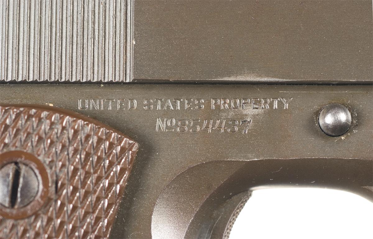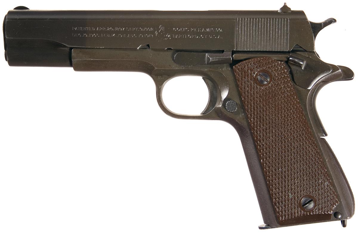Produced in 1943. Fixed sights, with the two line, two block address/patent marking with the Rampant Colt in the center on the left side of the slide, "P" on top and the matching serial number around the firing pin hole. The frame is marked with the "G.H.D" inspection stamp, "R/ VP" on the trigger guard, and "No" style serial number. Fitted with a checkered wide hammer, milled trigger, checkered slide stop and thumb safety, long grip safety, arched checkered mainspring housing and late war style Coltwood grips. Barrel is Colt production.